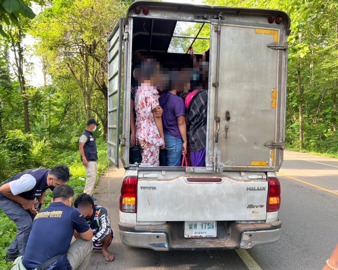 ต่อมา เวลา 07.00 น. เจ้าหน้าที่สังเกตพบรถยนต์ลักษณะตามที่ได้รับแจ้งจากสายข่าว จึงได้ทำการติดตามไปจนกระทั้งถึงบริเวณหน้ารีสอร์ทแห่งหนึ่งในพื้นที่ ม.2 บ.องธิ ต.ท่าขนุน อ.ทองผาภูมิ จ.กาญจนบุรี จึงแสดงตัวเป็นเจ้าหน้าที่ฝ่ายความมั่นคงและให้สัญญาณหยุดรถ เพื่อทำการตรวจสอบ พบชายอายุ 23 ปี เป็นผู้ขับขี่รถยนต์ หมายเลขทะเบียน สกลนคร เจ้าหน้าที่สังเกตพบพิรุธชัดเจน จึงได้ขอทำการตรวจสอบตู้ทึบด้านท้ายรถยนต์กระบะคันดังกล่าว พบกลุ่มบุคคลลักษณะคล้ายต่างด้าวสัญชาติเมียนมา อัดแน่นเต็มคันรถ จำนวนทั้งสิ้น 48 คน (ชาย 31 คน, หญิง 17 คน) จึงขอทำการตรวจสอบเอกสารประจำตัวที่ทางราชการออกให้ แต่กลุ่มบุคคลต่างด้าวดังกล่าวไม่สามารถแสดงเอกสารต่อเจ้าหน้าที่ได้