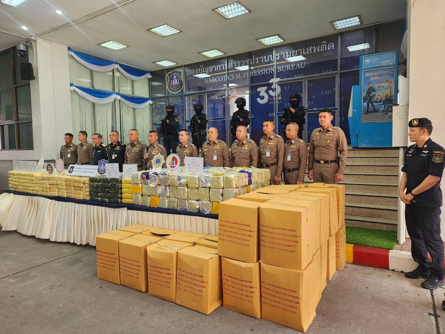 กองบัญชาการตำรวจปราบปรามยาเสพติด (บช.ปส.) พล.ต.ท.สำราญ นวลมา ในฐานะ รอง ผอ.ศอ.ปส.ตร. พล.ต.ท.สันติ ชัยนิรามัย ผบช.ปส. พล.ต.ต.สมบูรณ์ เทียนขาว รอง ผบช.ปส. พล.ต.ต.ออมสิน ตรารุ่งเรือง รอง ผบช.ปส. พล.ต.ต.พรศักดิ์ สุรสิทธิ์ รอง ผบช.ปส. พล.ต.ต.ธนรัชน์ สอนกล้า รอง ผบช.ปส. และเจ้าหน้าที่ที่เกี่ยวข้องแถลงผลการสืบสวนติดตามจับกุม และขยายผลเครือข่ายค้ายาเสพติดรายใหญ่และรายย่อย ทั่วทุกพื้นที่ของประเทศไทย รวมทั้งการขยายผลไปสู่การจับกุมเครือข่ายที่ยังหลบหนี และยึดทรัพย์ผู้ที่ให้การสนับสนุนและช่วยเหลือทุกราย