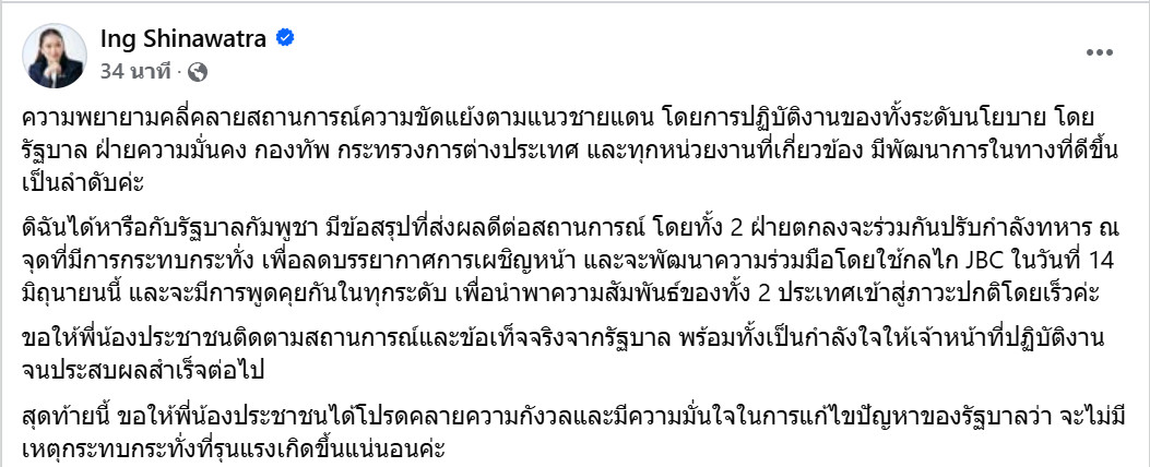 ดิฉันได้หารือกับรัฐบาลกัมพูชา มีข้อสรุปที่ส่งผลดีต่อสถานการณ์ โดยทั้ง 2 ฝ่ายตกลงจะร่วมกันปรับกำลังทหาร ณ จุดที่มีการกระทบกระทั่ง เพื่อลดบรรยากาศการเผชิญหน้า และจะพัฒนาความร่วมมือโดยใช้กลไก JBC ในวันที่ 14 มิ.ย.นี้ และจะมีการพูดคุยกันในทุกระดับ เพื่อนำพาความสัมพันธ์ของทั้ง 2 ประเทศเข้าสู่ภาวะปกติโดยเร็ว
