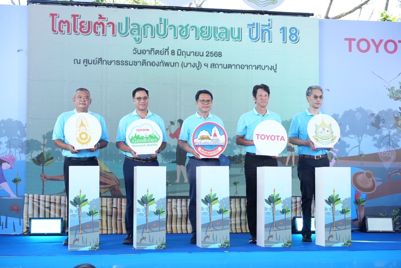 นายธีรพล ศรีโมรา ผู้อำนวยการสำนักงานทรัพยากรธรรมชาติและสิ่งแวดล้อมจังหวัดสมุทรปราการ พลตรี ยุทธนา ธรรมธร เสนาธิการกรมพลาธิการทหารบก พลโท จินตมัย ชีกว้าง เจ้ากรมกิจการพลเรือนทหารบก คุณกลินทร์ สารสิน ประธานคณะกรรมการ และมร.โนริอากิ ยามาชิตะ กรรมการผู้จัดการใหญ่บริษัท โตโยต้า มอเตอร์ ประเทศไทย จำกัด พร้อมด้วยผู้บริหารระดับสูง ผู้ผลิตชิ้นส่วนโตโยต้า ผู้แทนจำหน่ายโตโยต้า ลูกค้า ตลอดจนหน่วยงานพันธมิตร ทั้งภาครัฐ ภาคเอกชน และประชาชน ร่วมปลูกป่าชายเลนจำนวน 50,000 ต้น เพื่อมุ่งสู่เป้าหมายความเป็นกลางทางคาร์บอนอย่างยั่งยืน ผ่านกิจกรรม “โตโยต้าปลูกป่าชายเลน ปีที่ 18” ณ สถานตากอากาศบางปู จังหวัดสมุทรปราการ เมื่อวันที่ 8 มิถุนายน 2568