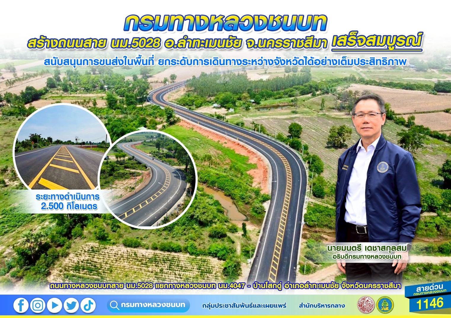 กรมทางหลวงชนบท (ทช.) ดำเนินโครงการก่อสร้างถนนทางหลวงชนบทสาย นม.5028 แยกทางหลวงชนบท นม.4047 - บ้านโสกดู่ อำเภอลำทะเมนชัย จังหวัดนครราชสีมา เสร็จสมบูรณ์ พร้อมเปิดให้ประชาชนใช้สัญจรได้เรียบร้อยแล้ว
