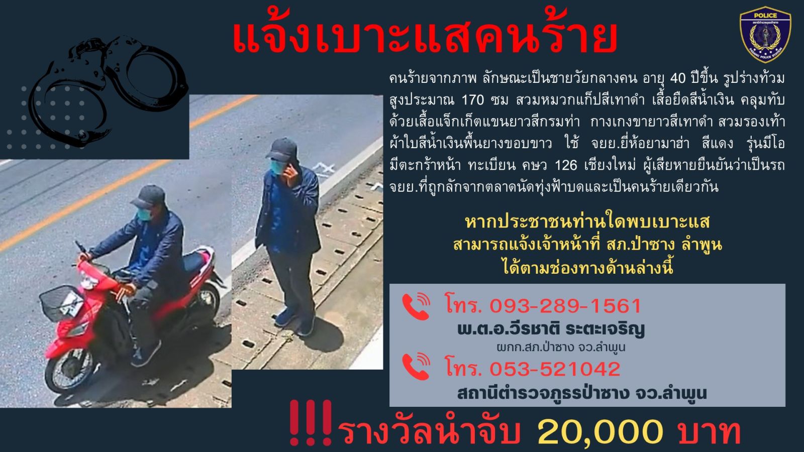 ตร.สภ.ป่าซาง ลำพูน ตั้งรางวัลนำจับ 2 หมื่นบาท คนชี้เบาะแสโจรวิ่งราวทรัพย์ร้านทอง