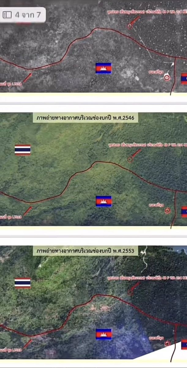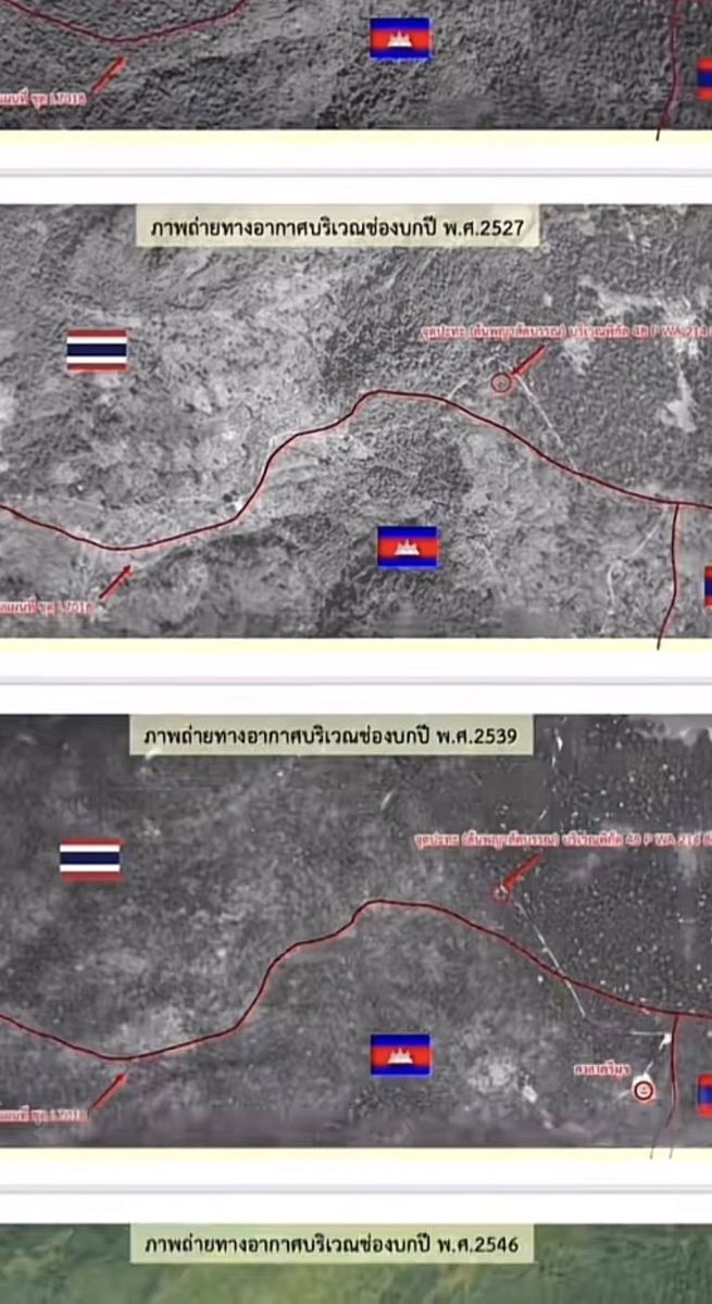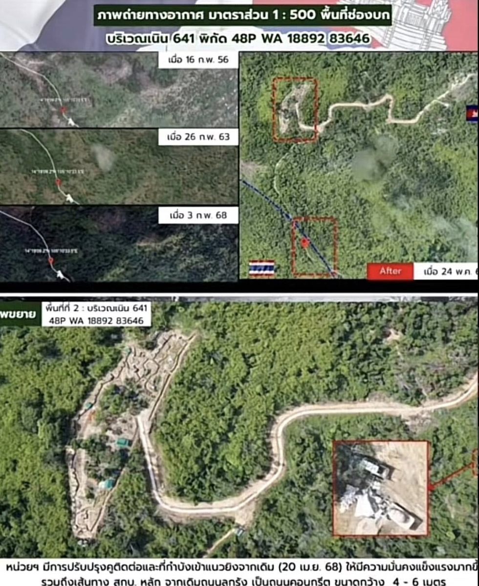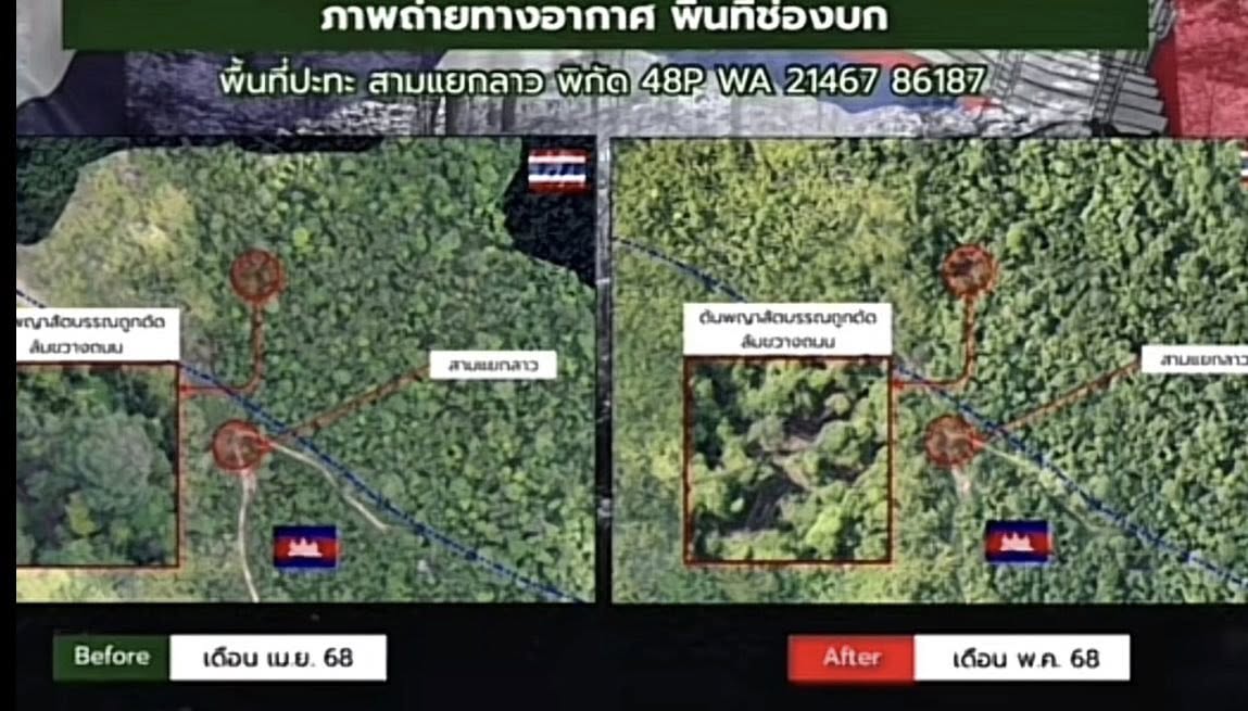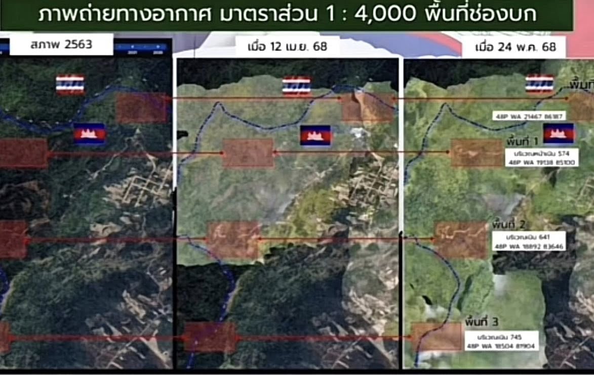 หลักฐานภาพถ่ายที่เปิดเผยโดยกรมแผนที่ทหารระบุชัดเจนว่าทหารกัมพูชาเพิ่งเริ่มเข้ามาวางกำลังในช่วงต้นปี มีนาคม-เมษายน 2568 ซึ่งแตกต่างจากที่สมเด็จฯ ฮุน เซน อดีตนายกรัฐมนตรีกัมพูชาอ้างว่ามีการยึดครองพื้นที่มานานก่อนการลงนามบันทึกความเข้าใจ (MoU) ปี 2543