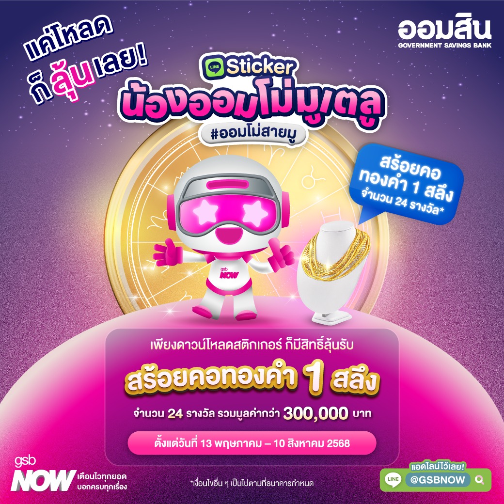 พิเศษ!! ทุกการดาวน์โหลดสติกเกอร์ไลน์ชุด "GSB NOW x น้องออมโม่มูเตลู" จะมีสิทธิ์ลุ้นรับรางวัล สร้อยคอทองคำ 1 สลึง จำนวน 24 รางวัล มูลค่ารวมกว่า 300,000 บาท * ติดตามประกาศผลผู้โชคดีผ่านช่องทาง LINE GSB NOW
