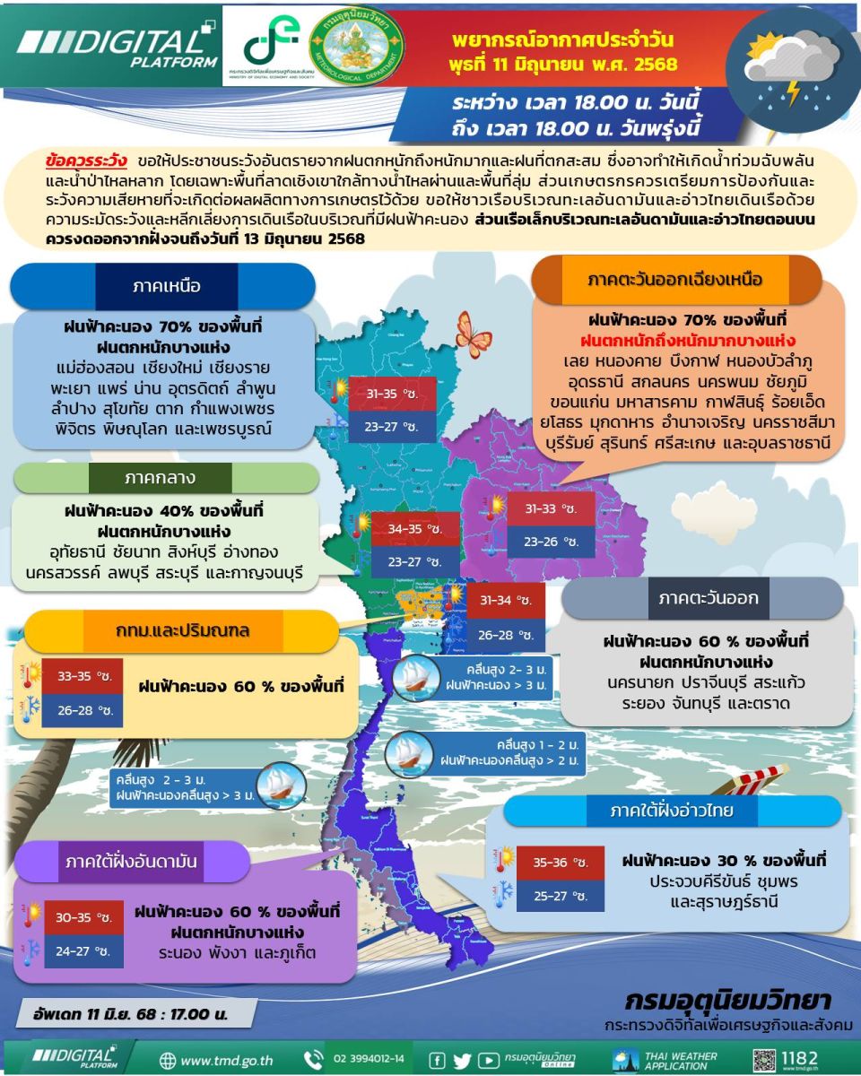 ประกาศกรมอุตุนิยมวิทยา เรื่อง พายุ “หวู่ติบ” บริเวณทะเลจีนใต้ตอนบน ฉบับที่ 6 (140/2568) เมื่อเวลา 16.00 น. ของวันนี้ (11 มิ.ย. 68) พายุโซนร้อน “หวู่ติบ” บริเวณทะเลจีนใต้ตอนบน มีศูนย์กลางห่างออกไปทางทิศตะวันออกเฉียงใต้ของเกาะไหหลำ ประมาณ 264 กิโลเมตร หรือที่ละติจูด 16.9 องศาเหนือ ลองจิจูด 112.1 องศาตะวันออก มีความเร็วลมสูงสุดใกล้ศูนย์กลางประมาณ 65 กิโลเมตรต่อชั่วโมง พายุนี้กำลังเคลื่อนตัวทางทิศตะวันตกค่อนทางเหนือเล็กน้อย ด้วยความเร็วประมาณ 25 กิโลเมตรต่อชั่วโมง และคาดว่าในช่วงวันที่ 13-16 มิ.ย. 68 จะเคลื่อนผ่านเกาะไหหลำเข้าประเทศจีนตอนใต้ หลังจากนั้นจะอ่อนกำลังลงเป็นพายุดีเปรสชัน และหย่อมความกดอากาศต่ำกำลังแรงตามลำดับ ขอให้ผู้ที่จะเดินทางไปบริเวณดังกล่าวตรวจสอบสภาพอากาศก่อนออกเดินทางในช่วงวันดังกล่าวไว้ด้วย โดยศูนย์กลางของพายุลูกนี้จะไม่เคลื่อนเข้าสู่ประเทศไทย แต่อาจทำให้มรสุมตะวันตกเฉียงใต้ที่พัดปกคลุมประเทศไทยมีกำลังแรงขึ้น ทำให้บริเวณด้านตะวันออกของภาคตะวันออกเฉียงเหนือมีฝนเพิ่มขึ้นและมีฝนตกหนักถึงหนักมากบางแห่ง และคลื่นลมในทะเลอันดามันและอ่าวไทยตอนบนมีกำลังค่อนข้างแรง