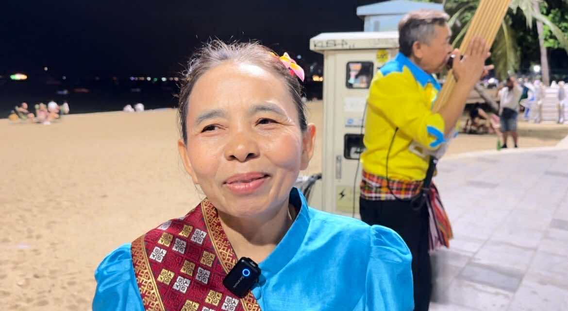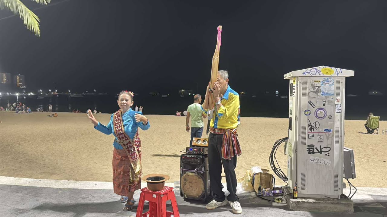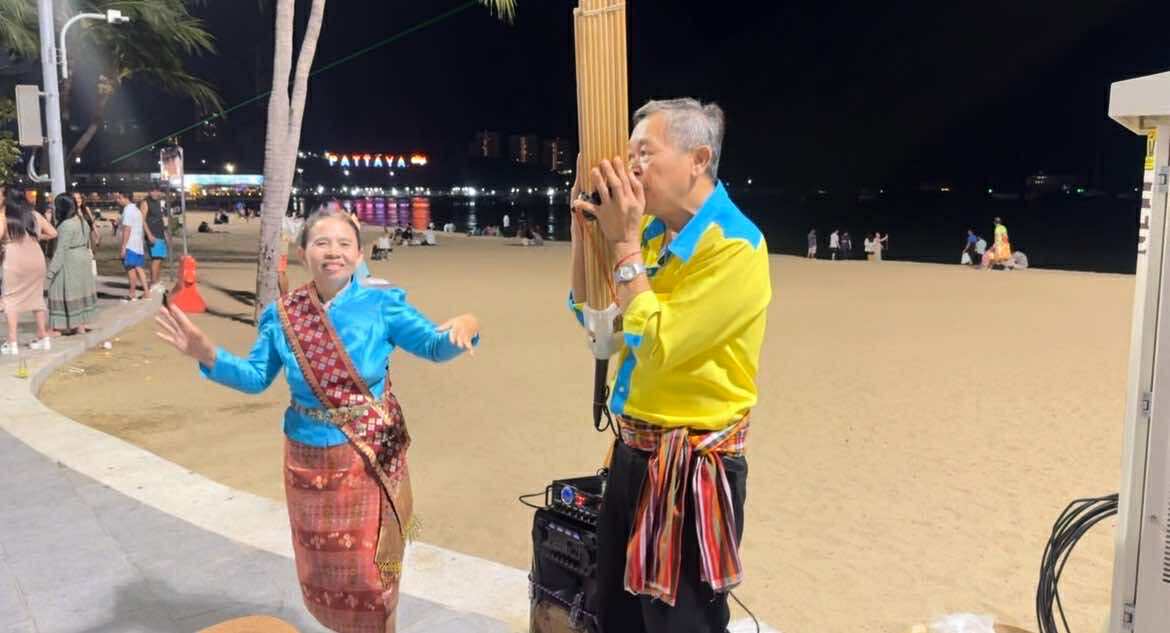 พัทยา – บรรยากาศยามค่ำคืนริมชายหาดเมืองพัทยา ไม่ได้มีเพียงแสงสีหรือความคึกคักจากสถานบันเทิงเท่านั้น แต่ล่าสุดนักท่องเที่ยวทั้งชาวไทยและชาวต่างชาติได้พบกับภาพที่แปลกตา ทว่าเต็มไปด้วยเสน่ห์ไม่เหมือนใคร เมื่อ “ลุงทอง” และ “ป้าพิสมัย” คู่รักวัย 57 ปี จากจังหวัดร้อยเอ็ด ได้นำศิลปวัฒนธรรมพื้นบ้านอีสานอย่างการเป่าแคนและฟ้อนรำ ออกมาแสดงเปิดหมวกริมชายหาด ท่ามกลางแสงไฟ เสียงคลื่น และสายลมทะเล