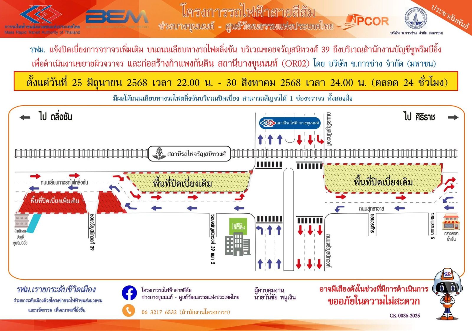 การรถไฟฟ้าขนส่งมวลชนแห่งประเทศไทย (รฟม.) แจ้งว่า บริษัท ช.การช่าง จำกัด (มหาชน) ผู้รับจ้างออกแบบและก่อสร้างอุโมงค์ทางวิ่งและสถานีใต้ดิน โครงการรถไฟฟ้าสายสีส้ม ช่วงบางขุนนนท์ – ศูนย์วัฒนธรรมแห่งประเทศไทย มีความจำเป็นต้องปิดเบี่ยงการจราจรเพิ่มเติม 2 ช่องจราจร ชิดทางเท้า บนถนนเลียบทางรถไฟตลิ่งชัน ฝั่งมุ่งหน้าตลิ่งชัน บริเวณซอยจรัญสนิทวงศ์ 39 ถึงบริเวณสำนักงานบัญชีซูพรีมบีอิ้ง เพื่อดำเนินงานขยายผิวจราจร และก่อสร้างกำแพงกันดิน สถานีบางขุนนนท์ (OR02) ตั้งแต่วันที่ 25 มิถุนายน 2568 เวลา 22.00 น. – 30 สิงหาคม 2568 เวลา 24.00 น. (ตลอด 24 ชั่วโมง)