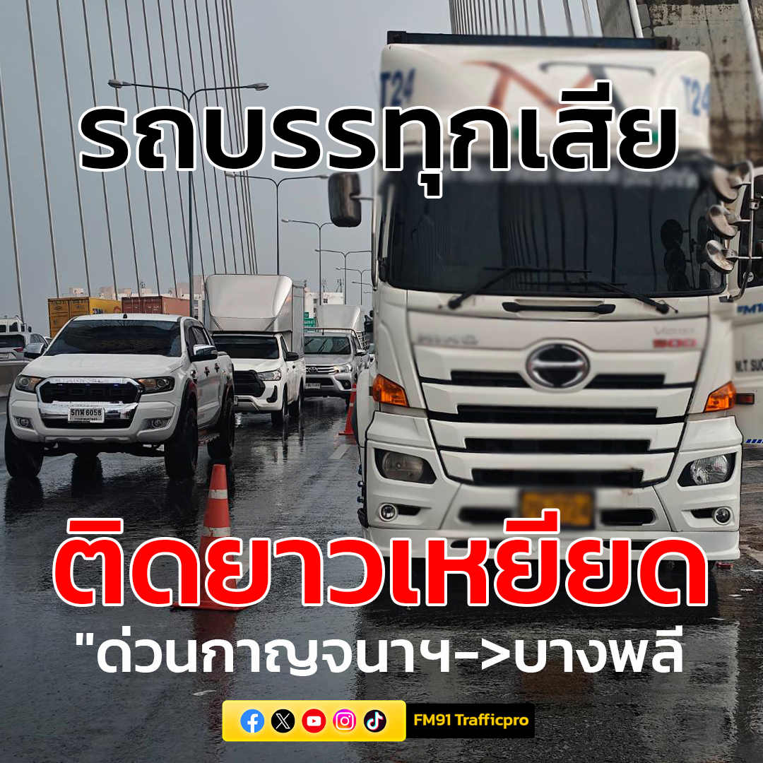 ตำรวจภูธรสมุทรปราการ แจ้งปชส. จราจร ในขณะนี้ เวลา 16.51 น. บนทางด่วนกาญจนาภิเษก (บางพลีสุขสวัสดิ์) จากพระราม 2 มุ่งหน้าไปบางพลี ช่วงกม.21B รถบรรทุกพ่วง ขัดข้องระบบเกียร์ระเบิด เบรคล็อค ทุกล้อ รถยกของ กู้ภัยกาญจนา ไม่สามารถยกได้ บริษัทได้นำรถยกและช่างกำลังเดินทางมา และพื้นที่ตอนนี้ฝนตกด้วย คาดว่าจะใช้เวลา ประมาณ 1 ชั่วโมง กรณีดังกล่าว รถติดสะสมไปแล้ว 13 กิโลเมตร