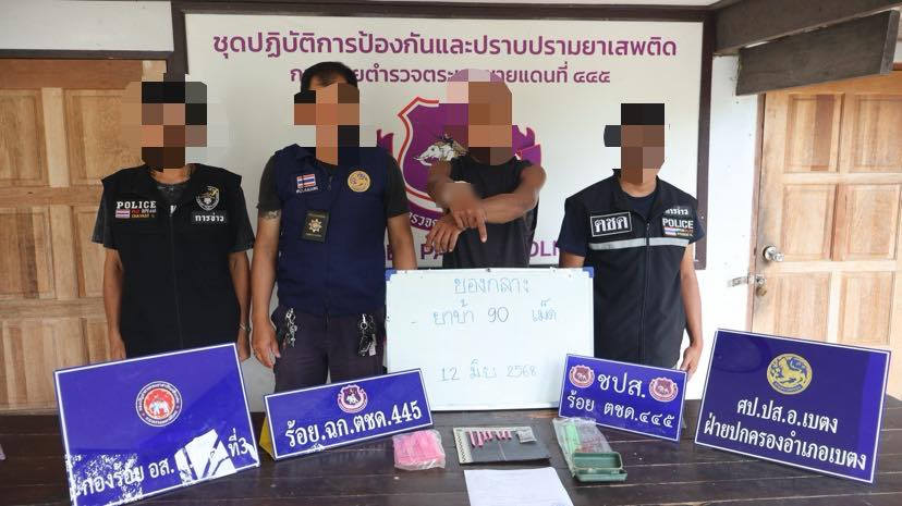 จึงรายงานให้ พ.ต.ท.อเนชา ตาวัน รอง ผบ.ฉก.ตชด.44 / ผบ.ร้อย ตชด.445 รับทราบ พร้อมประสาน นายมานิตย์ ยศศักดิ์ ปลัดอำเภอเบตง รับผิดชอบงานยาเสพติด นำกำลังเจ้าหน้าที่ ตชด และ อส.อำเภอเบตง เข้าตรวจสอบตรวจค้น จนสามารถจับกุม นายรอ (นามสมมุติ) อายุ 40 ปี ได้พร้อมของกลาง ยาบ้าจำนวน 7 หลอด รวม 90 เม็ด อยู่ในกล่องพลาสติกสีเขียว วางอยู่บนตอไม้ข้างขนำ และหลอดเครื่องดื่มไว้สำหรับแบ่งบรรจุยาบ้า จำนวนหนึ่ง วางไว้อยู่บนกองไม้บริเวณข้างขนำ เจ้าหน้าที่จึงนำตัวมาสอบ ทำการตรวจปัสสาวะ และทำบันทึกจับกุมที่ กองร้อย ตชด.445
