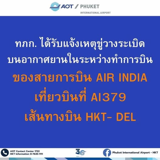 วันนี้ (13 มิถุนายน 2568) เมื่อเวลา 09.30 น. ท่าอากาศยานภูเก็ต (ทภก.) ได้รับแจ้งเหตุจากศูนย์ควบคุมการบิน บริษัท วิทยุการบินแห่งประเทศไทย จำกัด ว่านักบินของสายการบิน AIR INDIA เที่ยวบินที่ AI 379 เส้นทางบิน HKT- ภูเก็ต - DEL (เดลี) ผู้โดยสารจำนวน 156 คน