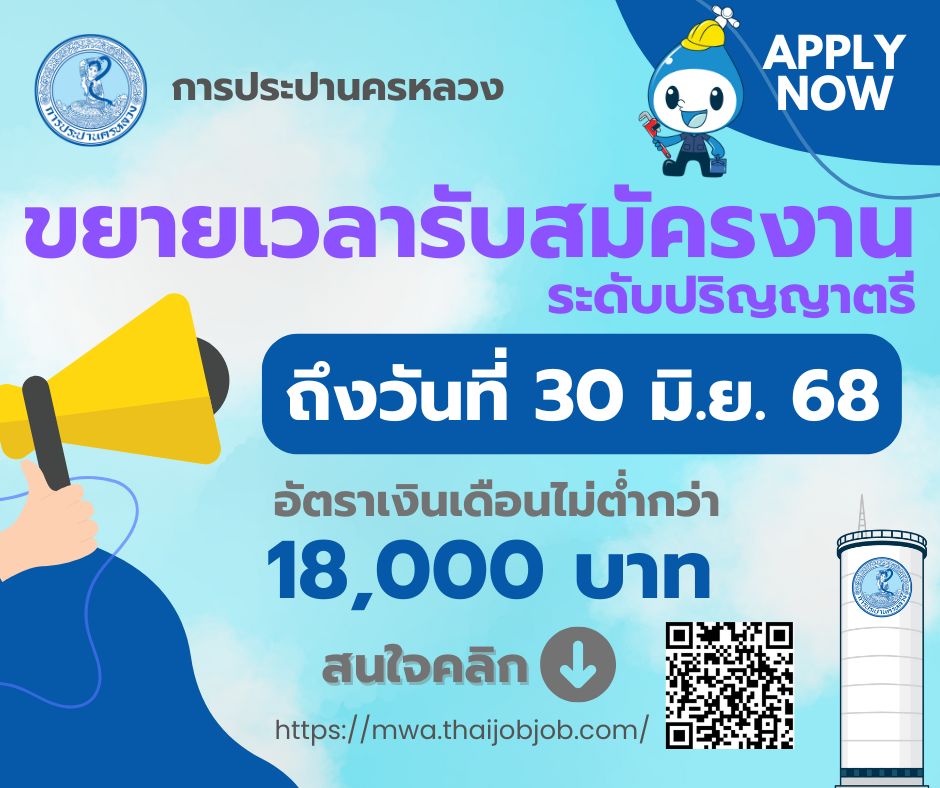 ผู้สนใจสามารถดูรายละเอียดได้ที่ https://mwa.thaijobjob.com/ เปิดรับสมัครตั้งแต่บัดนี้ - 30 มิถุนายน 2568 (ทุกวัน) หรือสอบถามได้ที่ ส่วนสรรหาและบรรจุแต่งตั้ง การประปานครหลวง (สำนักงานใหญ่) ถ.ประชาชื่น โทร. 0 2504 0123 ต่อ 1562 หรือ 2624 ในวันและเวลาราชการ หรืออีเมล recrusec@mwa.co.th
