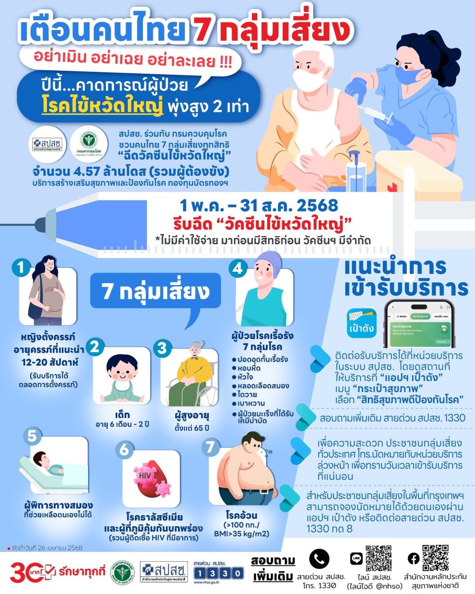 จากการดำเนินรณรงค์ฉีดวัคซีนถึงวันที่ 15 มิถุนายน 2568 ที่ผ่านมา มีประชาชนกลุ่มเสี่ยงเข้ารับบริการฉีดวัคซีนแล้วจำนวน 1,960,955 คน คิดเป็นร้อยละ 45.23 ของเป้าหมาย โดยแยกเป็นกลุ่มเสี่ยง ได้แก่ 1.ผู้สูงอายุตั้งแต่ 65 ปี จำนวน 1,001,162 คน 2.ผู้ป่วยโรคเรื้อรัง 7 กลุ่มโรค จำนวน 966,925 คน (ปอดอุดกั้นเรื้อรัง, หอบหืด, หัวใจ, หลอดเลือดสมอง,ไตวาย, เบาหวาน และผู้ป่วยมะเร็งที่ได้รับเคมีบำบัด) 3.โรคอ้วน (>100 กก. / BMI > 35 kg/m2) จำนวน 36,392 คน 4.โรคธาลัสซีเมียและผู้ที่ภูมิคุ้มกันบกพร่อง (รวมผู้ติดเชื้อ HIV ที่มีอาการ) จำนวน 27,180 คน 5.เด็กอายุ 6 เดือน - 2 ปี จำนวน 1,785 คน 6.ผู้พิการทางสมองที่ช่วยเหลือตนเองไม่ได้ จำนวน 576 คน และ 7.หญิงตั้งครรภ์ อายุครรภ์ที่แนะนำ 12 - 20 สัปดาห์ (สามารถให้ได้ตลอดการตั้งครรภ์)