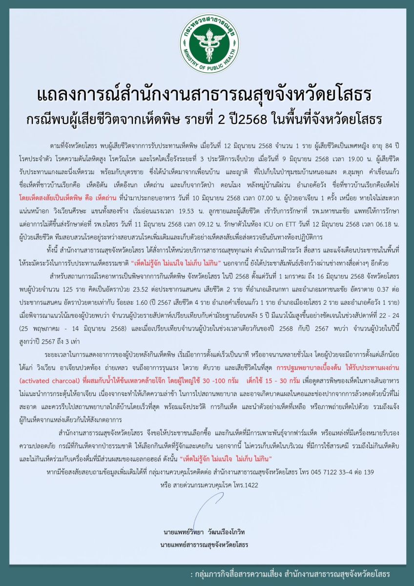 วันนี้ (17 มิ.ย. 68) นายแพทย์วิทยา วัฒนเรืองโกวิท นายแพทย์สาธารณสุขจังหวัดยโสธร ได้ออกแถลงการณ์สำนักงานสาธารณสุขจังหวัดยโสธรกรณีพบผู้เสียชีวิตจากเห็ดพิษ คนที่ 2 ปี 2568 ในพื้นพื้นที่ จ.ยโสธร
