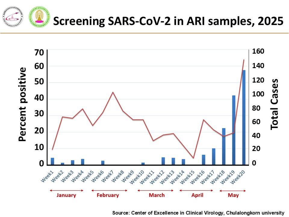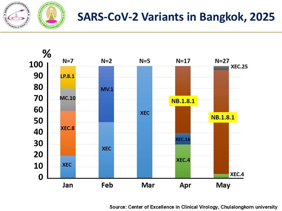 วันที่ 17 มิถุนายน 2568 ศ.นพ.ยง ภู่วรวรรณ หัวหน้าศูนย์เชี่ยวชาญเฉพาะทางด้านไวรัสวิทยาคลินิก คณะแพทยศาสตร์ จุฬาลงกรณ์มหาวิทยาลัย โพสต์เฟซบุ๊ก Yong Poovorawan ยืนยันโควิด 19 สายพันธุ์ที่ติดต่อง่ายมาก NB.1.8.1 เป็นสายพันธุ์หลักในประเทศไทยแล้ว โดยระบุต่อว่า การระบาดอย่างมากของโควิด 19 ในช่วงเดือนที่ผ่านมา เพิ่มขึ้นอย่างเห็นได้ชัดเจน เพราะสายพันธุ์ที่ระบาดเป็นสายพันธุ์ NB.1.8.1 ซึ่งติดต่อกันได้ง่ายมากกว่าสายพันธุ์เดิม แพร่กระจายอย่างรวดเร็วมียอดผู้ป่วยจำนวนมากในเดือนที่ผ่านมา และเป็นสายพันธุ์หลักหรือกล่าวได้ว่าเกือบทั้งหมดเป็นสายพันธุ์นี้
