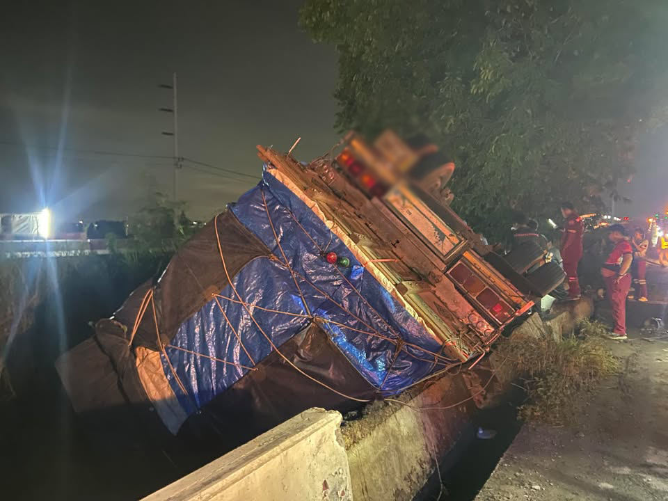 รถบรรทุกพลิกตะแคงลงข้างทาง ถนนกาญจนาภิเษก ฝั่งตะวันตก ช่วงเชิงลงสะพานข้ามแม่น้ำเจ้าพระยา จนท.กำลังเคลื่อนย้าย จ.พระนครศรีอยุธยา