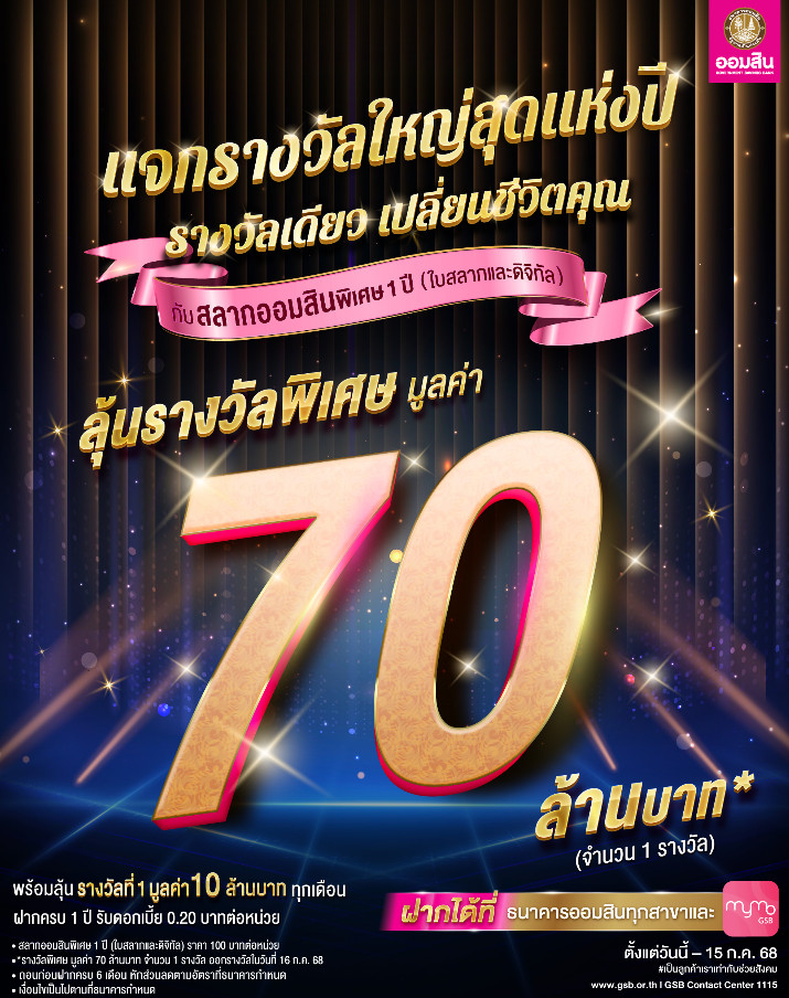 ลุ้นรางวัลพิเศษมูลค่า 70 ล้านบาท ฝากเลยที่ MyMo >> https://to.gsb.or.th/w9RAlFHA