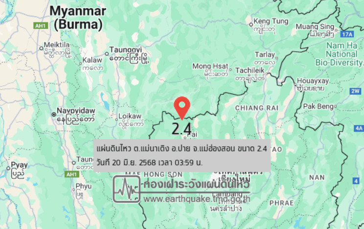 วันที่ 20 มิ.ย. 2568 เวลา 03.59 น. กองเฝ้าระวังแผ่นดินไหว กรมอุตุนิยมวิทยา แจ้งเหตุ แผ่นดินไหว ขนาด 2.4 ความลึก 2 กม. ภายในพื้นที่ของ ต.แม่นาเติง อ.ปาย จ.แม่ฮ่องสอน (19.65°N,98.38°E) ขณะนี้ยังไม่มีรายงานการรับรู้ถึงแรงสั่นสะเทือน