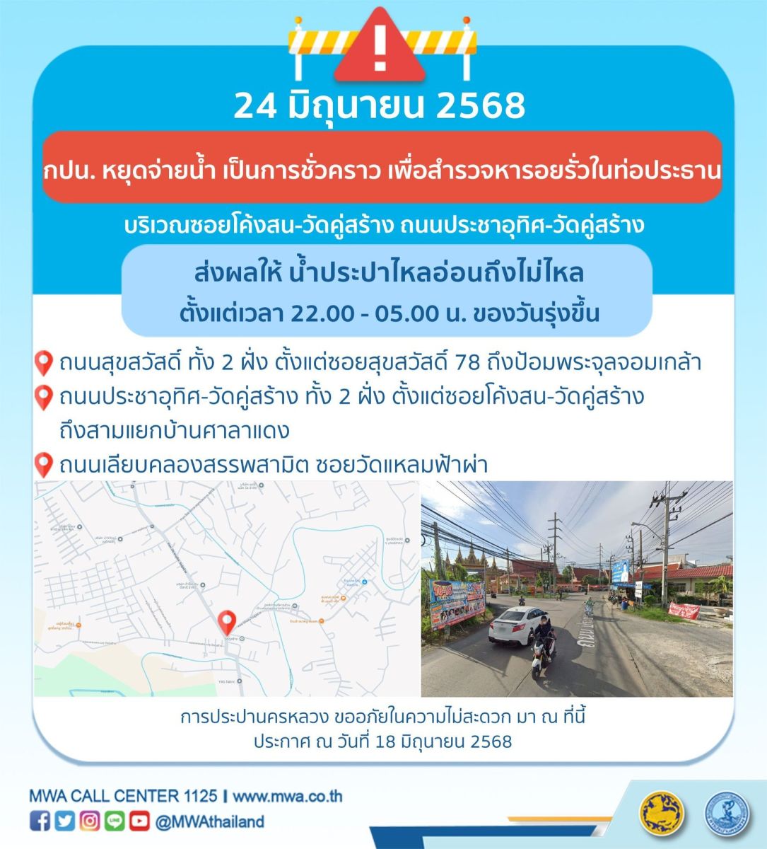 การประปานครหลวง (กปน.) ขอแจ้งให้ทราบว่า จะดำเนินการสำรวจหารอยรั่วในท่อประธาน ในพื้นที่บริเวณซอยโค้งสน-วัดคู่สร้าง ถนนประชาอุทิศ-วัดคู่สร้าง เพื่อให้ประชาชนได้รับบริการน้ำประปาอย่างเพียงพอและทั่วถึง จึงมีความจำเป็นต้องหยุดจ่ายน้ำ เป็นการชั่วคราว ในคืนวันอังคารที่ 24 มิถุนายน 2568 ตั้งแต่เวลา 22.00 - 05.00 น. ของวันรุ่งขึ้น โดยระหว่างดำเนินการ ส่งผลให้ น้ำประปาไหลอ่อนถึงไม่ไหล ในพื้นที่ดังต่อไปนี้