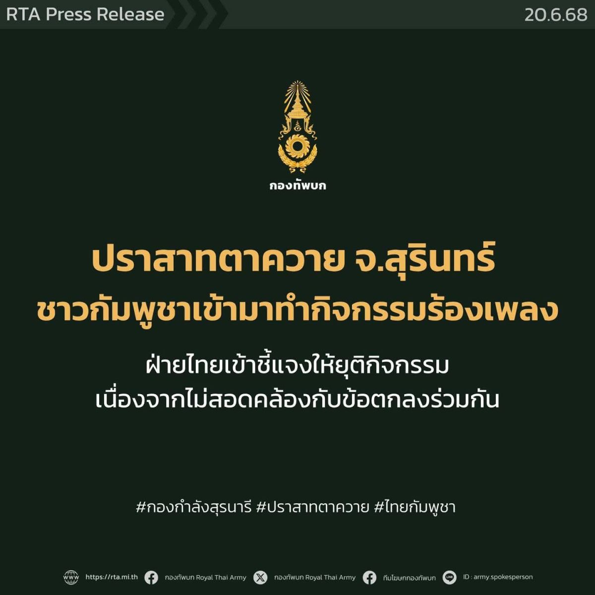 กองทัพบกได้รับรายงานจากกองกำลังสุรนารี โดยกองร้อยทหารพรานที่ 2602 เมื่อวันที่ 18 มิถุนายน 2568 เวลาประมาณ 13.00 น. พบคณะนักท่องเที่ยวชาวกัมพูชาจำนวนประมาณ 30 คน เดินทางเข้ามายังบริเวณปราสาทตาควาย ตำบล บักได อำเภอ พนมดงรัก จังหวัด สุรินทร์ โดยได้มีการบันทึกภาพ วิดีโอ และร่วมร้องเพลงในพื้นที่ดังกล่าว ซึ่งเจ้าหน้าที่ทหารฝ่ายไทยได้เข้าระงับเหตุการณ์อย่างสุภาพและเหมาะสม พร้อมทั้งเข้าเจรจาอธิบายด้วยเหตุผล เพื่อสร้างความเข้าใจ โดยชี้แจงให้ทราบว่า การแสดงออกเชิงสัญลักษณ์ในพื้นที่ดังกล่าว ไม่สอดคล้องกับแนวทางและข้อตกลงร่วมกัน ที่ทั้งสองฝ่ายเคยหารือไว้ก่อนหน้านี้ จึงขอความร่วมมือให้งดเว้นพฤติกรรมในลักษณะเช่นนี้ โดย คณะนักท่องเที่ยวกัมพูชาได้แสดงความเข้าใจและยุติกิจกรรมโดยสมัครใจ ก่อนเดินทางกลับจากพื้นที่ โดยใช้เวลาอยู่ในบริเวณดังกล่าวประมาณ 20 นาที เหตุการณ์เป็นไปด้วยความเรียบร้อยและยังสามารถพูดคุยในบรรยากาศที่ดีตามแนวทางความร่วมมือที่ทั้งสองฝ่ายยึดถือร่วมกัน