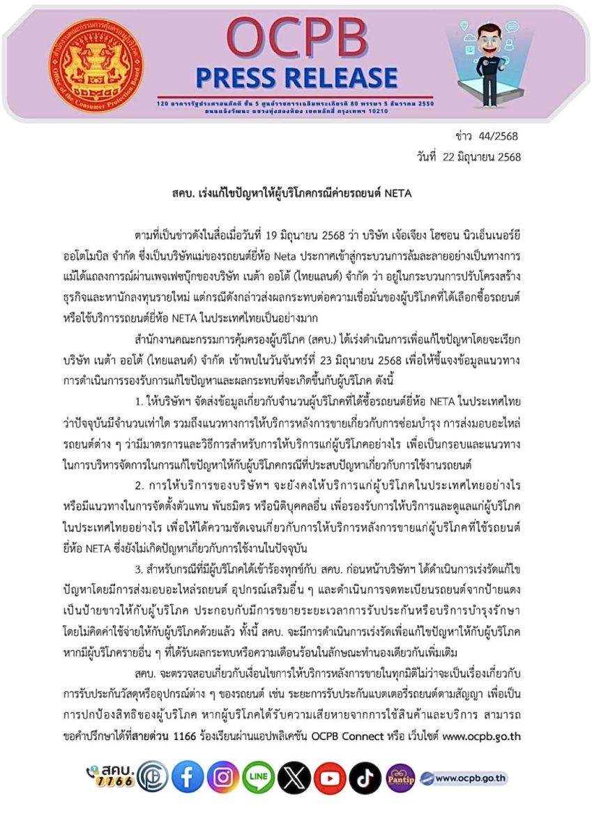 สํานักงานคณะกรรมการคุ้มครองผู้บริโภค (สคบ.) ได้เร่งดําเนินการเพื่อแก้ไขปัญหาโดยจะเรียกบริษัท เนต้า ออโต้ (ไทยแลนด์) จํากัด เข้าพบในวันจันทร์ที่ 23 มิถุนายน 2568 เพื่อให้ชี้แจงข้อมูลแนวทาง การดําเนินการรองรับการแก้ไขปัญหาและผลกระทบที่จะเกิดขึ้นกับผู้บริโภค ดังนี้
