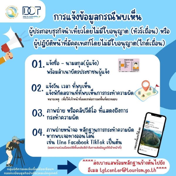 กรมการท่องเที่ยวขอเน้นย้ำให้ผู้ประกอบธุรกิจนำเที่ยวทุกราย ยึดมั่นในการดำเนินธุรกิจอย่างถูกต้อง และขอความร่วมมือประชาชน หากพบเห็นพฤติกรรมที่เข้าข่ายขายทัวร์ดังกล่าว เช่น การโพสต์เชิญชวนร่วมทริปท่องเที่ยวผ่านสื่อสังคมออนไลน์ในรูปแบบต่างๆ โดยมีลักษณะแสวงหากำไร สามารถแจ้งเบาะแสได้ที่กรมการท่องเที่ยว สายด่วน 0 2401 1111 และทางอีเมล tgtcenter@tourism.go.th