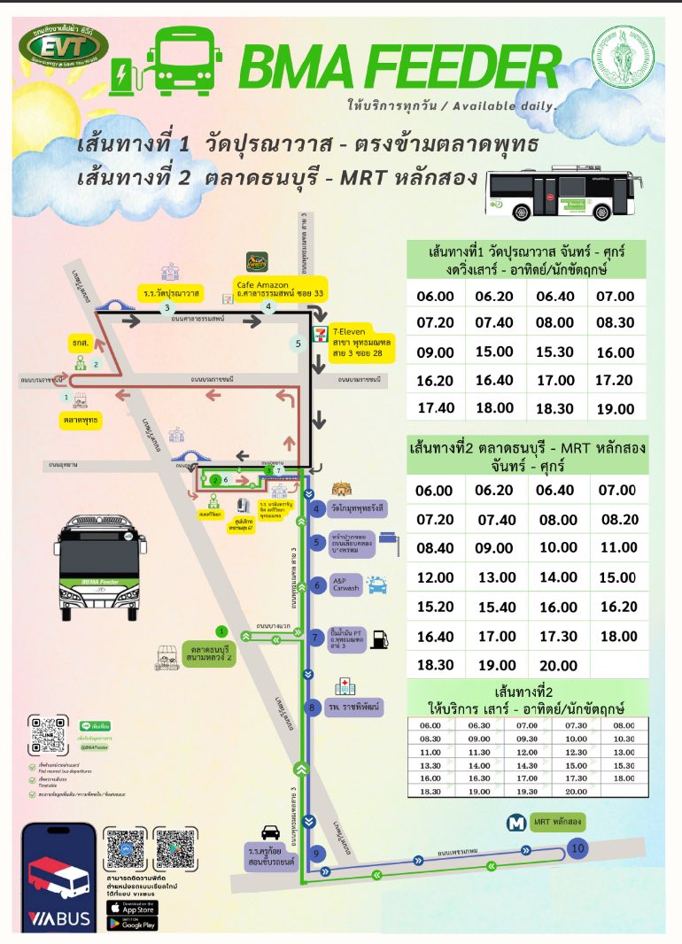 (23 มิ.ย. 68) นายเอกวรัญญู อัมระปาล โฆษกของกรุงเทพมหานคร เปิดเผยถึงโครงการ "BMA Feeder" ว่า ปัจจุบันกรุงเทพมหานครให้บริการ "BMA Feeder" จำนวน 2 เส้นทาง ได้แก่ 1.เส้นทาง วัดปุรณาวาส - ตรงข้ามสะพานพุทธ ให้บริการวันจันทร์-วันศุกร์ ระหว่างเวลา 06.00-20.00 น. 2.เส้นทาง ตลาดธนบุรี - MRT หลักสอง ให้บริการทุกวันระหว่างเวลา 06.00-20.00 น. โดยเปิดให้บริการตั้งแต่วันที่ 9 ธ.ค.67 และมีกำหนดจะเปิดให้บริการเพิ่มเติมอีก 5 เส้นทาง ในวันที่ 1 ก.ค.68 ประกอบด้วย 1.เส้นทาง ดินแดง - BTS สนามเป้า ให้บริการทุกวันระหว่างเวลา 06.00-20.00 น. 2.เส้นทาง MRT บางขุนนนท์ - 4 ตลาดน้ำตลิ่งชัน ให้บริการเฉพาะวันเสาร์ วันอาทิตย์ และวันหยุดนักขัตฤกษ์ เวลา 09.00-17.30 น. 3.เส้นทาง ถ.สามเสน เชื่อมต่อฝั่งธนบุรี (ตั้งฮั่วเส็ง) ให้บริการวันจันทร์-วันศุกร์ ระหว่างเวลา 06.00-19.00 น. 4.เส้นทาง ชุมชนเคหะร่มเกล้า - ARL ลาดกระบัง ให้บริการทุกวันระหว่างเวลา 06.00-20.00 น. และ 5. เส้นทาง พิพิธภัณฑ์เด็กฯ (จตุจักร) - BTS หมอชิต ให้บริการเฉพาะวันเสาร์ วันอาทิตย์ และวันหยุดนักขัตฤกษ์ เวลา 09.00-17.30 น.