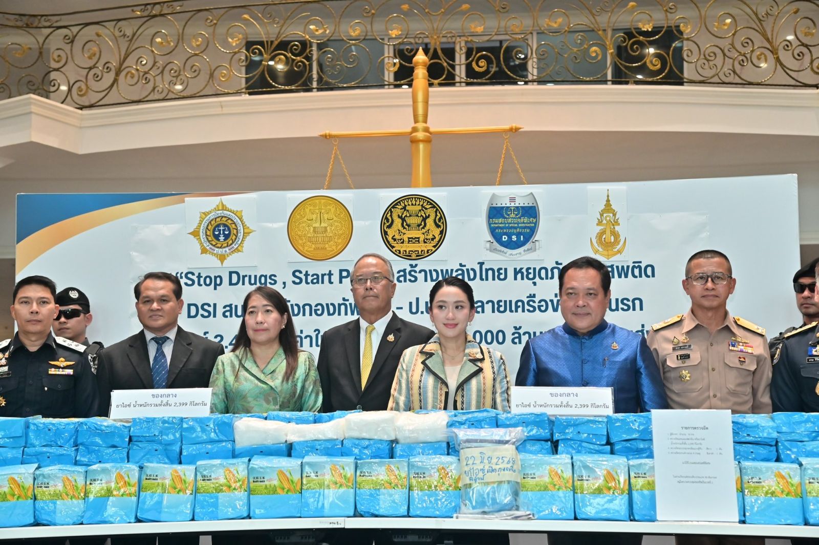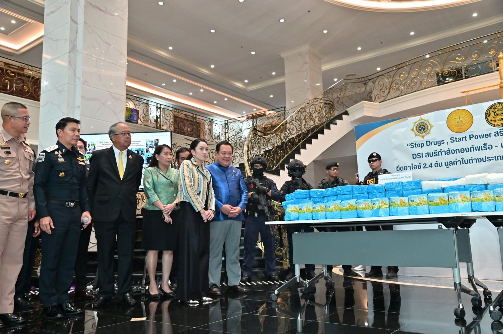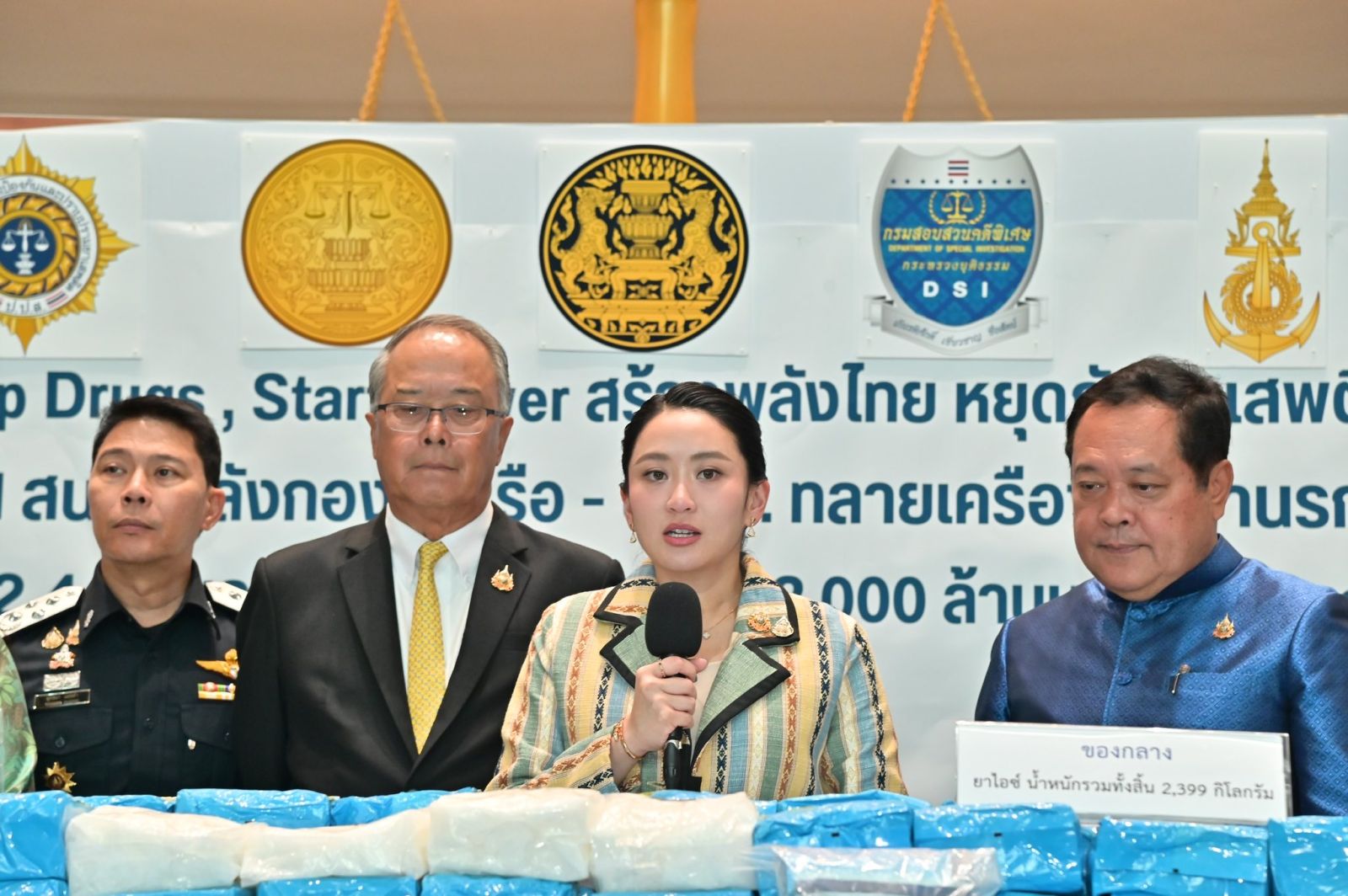 ในวันจันทร์ที่ 23 มิถุนายน 2568 เวลา 16.00 น. นางสาวแพทองธาร ชินวัตร นายกรัฐมนตรี นายชูศักดิ์ ศิรินิล รัฐมนตรีประจำสำนักนายกรัฐมนตรี (กำกับดูแลกรมสอบสวนคดีพิเศษ) พันตำรวจเอก ทวี สอดส่อง รัฐมนตรีว่าการกระทรวงยุติธรรม (กำกับดูแลสำนักงานคณะกรรมการป้องกันและปราบปรามยาเสพติด) นางพงษ์สวาท นีละโยธิน ปลัดกระทรวงยุติธรรม นายโกมล พรมเพ็ง รองปลัดกระทรวงยุติธรรม พันตำรวจตรี ยุทธนา แพรดำ อธิบดีกรมสอบสวนคดีพิเศษ ร้อยตำรวจเอก สุรวุฒิ รังไสย์ รองอธิบดีกรมสอบสวนคดีพิเศษ นายวิทวัส สุคันธรส ผู้อำนวยการกองคดียาเสพติด นายมานะ ศิริพิทยาวัฒน์ รองเลขาธิการ ป.ป.ส. พลเรือโท อาภา ชพานนท์ ผู้บัญชาการทัพเรือภาค 1 พลเรือโท วีรุดม ม่วงจีน รองเสนาธิการทหารเรือ (สายงานข่าว) ร่วมกันแถลงข่าว “DSI สนธิกำลังกองทัพเรือ - ป.ป.ส. ทลายเครือข่ายยานรก ยึดยาไอซ์ 2.4 ตัน มูลค่าในต่างประเทศกว่า 3,000 ล้านบาท เตรียมส่งออก”