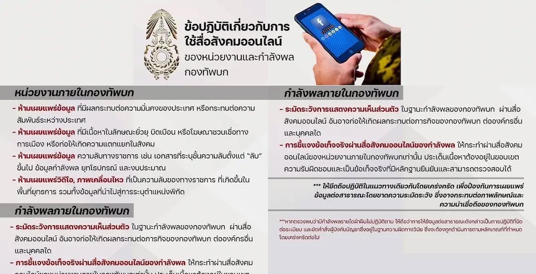 (23 มิ.ย.68) กองทัพบกได้ออกประกาศข้อปฏิบัติเกี่ยวกับการใช้สื่อสังคมออนไลน์ของหน่วยงานและกำลังพลกองทัพบก เกี่ยวกับข้อปฏิบัติในการใช้สื่อสังคมออนไลน์ ของหน่วยงานและกำลังพลโดยมีการเผยแพร่ในเพจของหน่วยงานทหาร