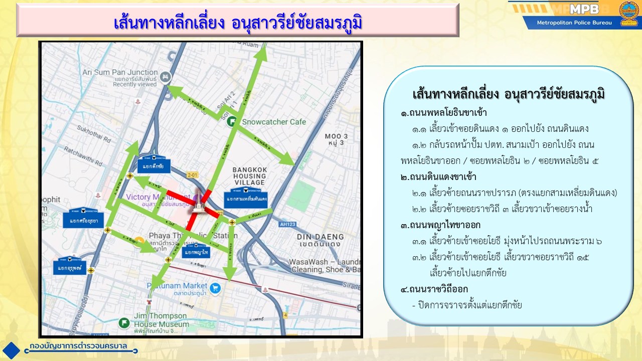 กองบัญชาการตำรวจนครบาล แจ้งข่าวประชาสัมพันธ์เส้นทางหลีกเลี่ยง อนุสาวรีย์ชัยสมรภูมิ ในวันที่ 28 มิถุนายน 2568