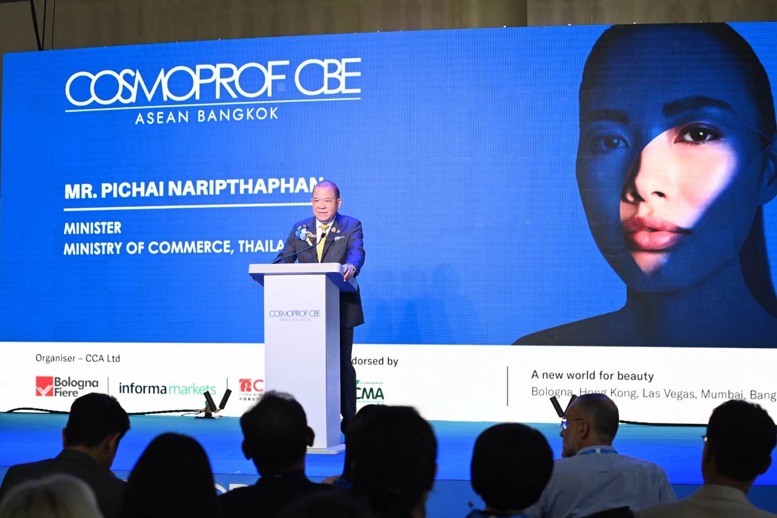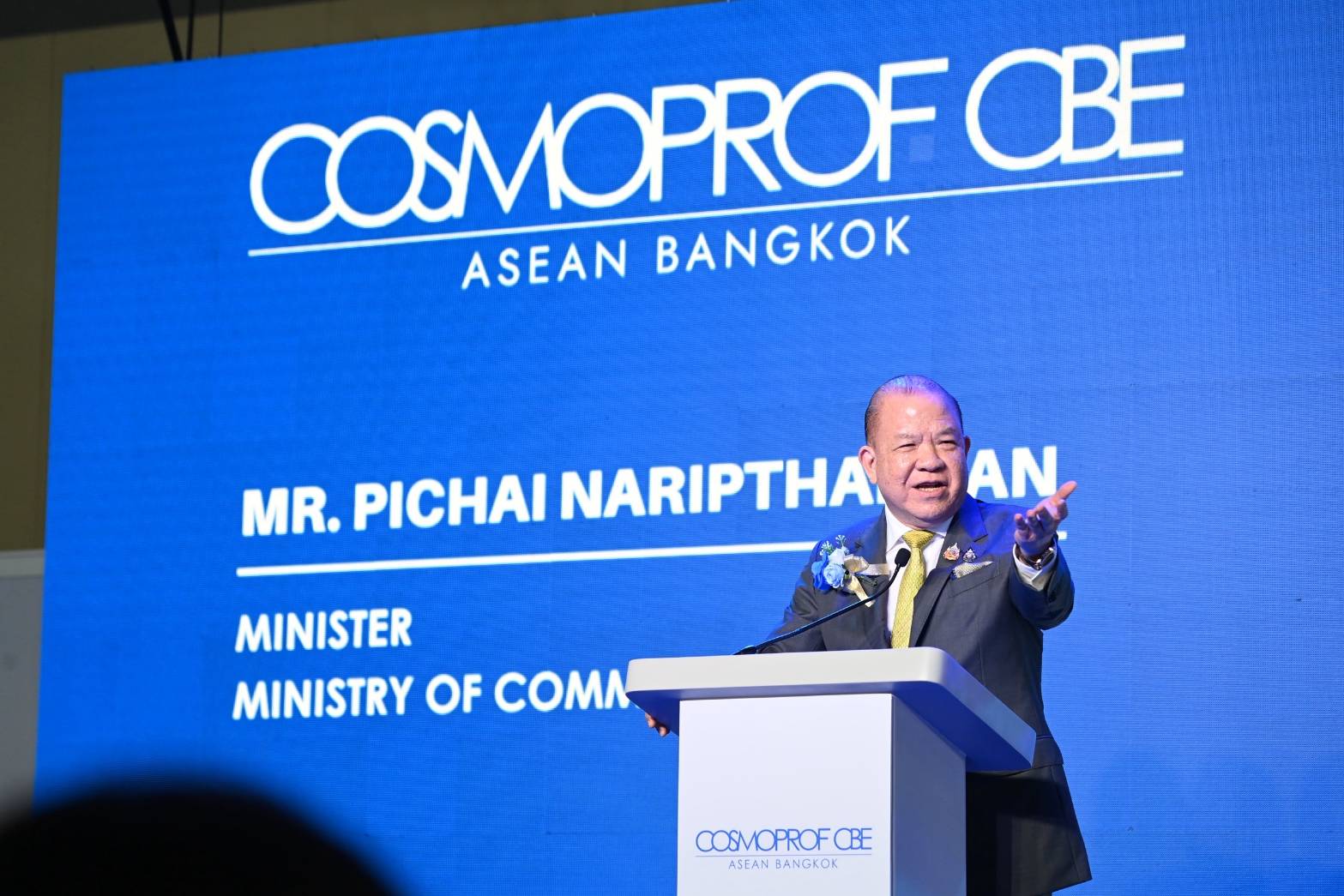 วันที่ 25 มิถุนายน 2568 นายพิชัย นริพทะพันธุ์ รัฐมนตรีว่าการกระทรวงพาณิชย์ เป็นประธานเปิดงาน Cosmoprof CBE ASEAN Bangkok 2025 ณ ศูนย์การประชุมแห่งชาติสิริกิติ์ โดยมีผู้บริหารระดับสูงทั้งจากภาครัฐและเอกชนร่วมงาน อาทิ นายวรวงศ์ รามางกูร ผู้ช่วยรัฐมนตรีประจำกระทรวงพาณิชย์ นางสุภาพร สุขมาก รองอธิบดีกรมส่งเสริมการค้าระหว่างประเทศ (DITP) Ms.Donna Chai ผู้จัดการทั่วไป BolognaFiere Cosmoprof Asia และนายมนู เลียวไพโรจน์ ประธานบริษัท อินฟอร์มา มาร์เก็ตส์ ประเทศไทย จำกัด