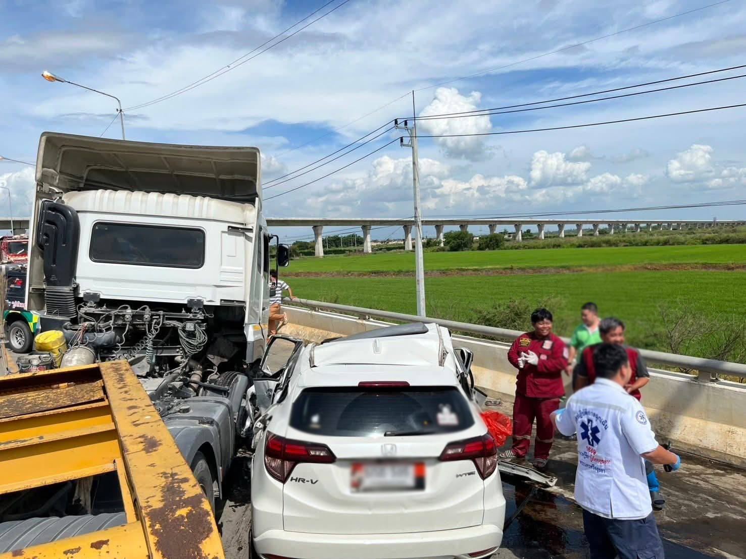 รถเทรลเลอร์ชนกับรถอเนกประสงค์ เชิงสะพานข้ามถนนรถไฟ ถนนเลี่ยงเมืองพระนครศรีอยุธยา มีผู้เสียชีวิตติดค้างในซากรถ