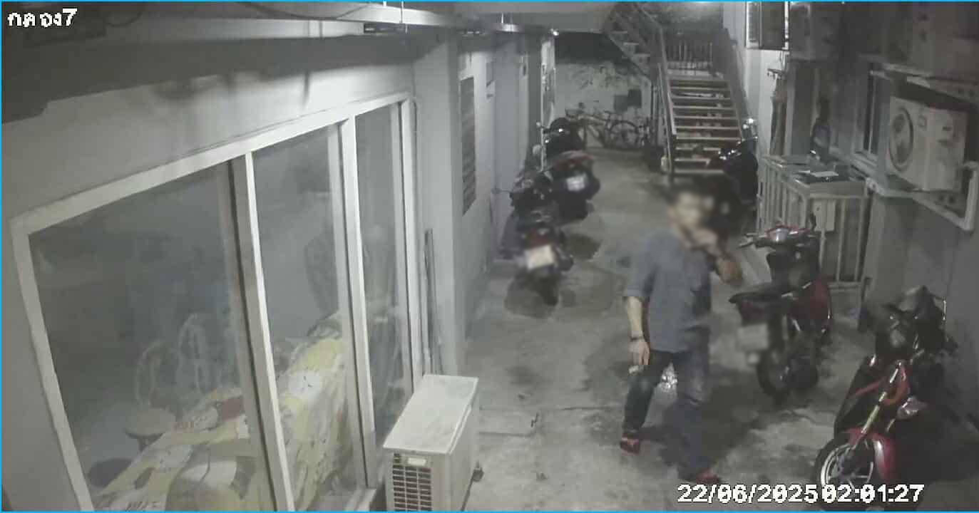 หลังเกิดเหตุตำรวจได้ไปตรวจสอบที่เกิดเหตุพบกล้องวงจรปิดบันทึกภาพ เวลา 01.56 น.วันที่ 22 มิ.ย. คนร้ายเป็นชาย อายุประมาณ 40 ปี สวมเสื้อแขนยาวพับแขนสีดำ สวมกางเกนยีนย์สีดำ ขับรถ จยย.สีแดง เข้ามาจอดในห้องพัก ก่อนเดินขึ้นไปชั้น 2 ปีนข้ามไปยังบ้านที่เกิดเหตุ เพื่อลักทรัพย์ ก่อนกลับออกมา เวลา 02.52 น.แต่เปลี่ยนจากกางเกงขายาวเป็นขาสั้น แล้วขับ จยย.หลบหนีไป