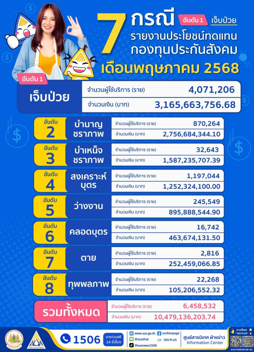 “โดยในเดือนพฤษภาคม 2568 มีผู้ประกันตนมาใช้สิทธิรวม จำนวน 6,458,532 ราย สำนักงานประกันสังคมจ่ายประโยชน์ทดแทนให้กับผู้ประกันตนไปแล้วทั้งสิ้น 10,479,136,203.74 บาท” นางมารศรี กล่าว