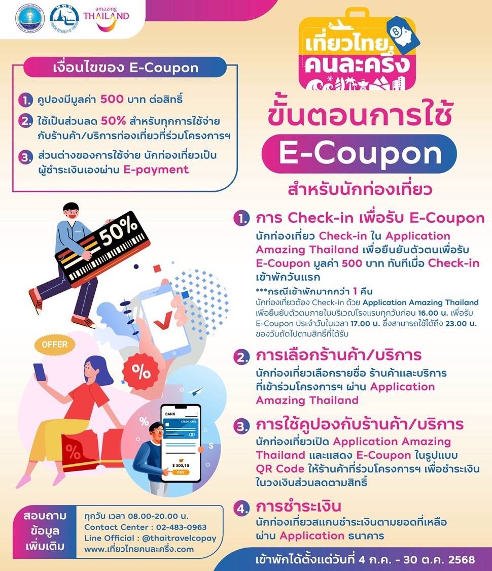 ทั้งนี้ เมื่อมีการเดินทางใช้สิทธิ์ ผู้ใช้สิทธิ์จะได้รับ e-Coupon มูลค่า 500 บาทต่อ 1 สิทธิ์ในระบบแอปพลิเคชั่น Amazing Thailand ทันที เมื่อเช็กอินเข้าพักผ่านทางแอปพลิเคชั่น Amazing Thailand และยืนยันตัวตนผ่านระบบ ThaID ณ โรงแรมที่พัก โดยสามารถใช้เป็นส่วนลด 50% สำหรับทุกการใช้จ่ายกับร้านค้าและสถานประกอบการที่เข้าร่วมโครงการ ทั้งนี้ ส่วนต่างของการใช้จ่าย ผู้ใช้สิทธิ์จะต้องเป็นผู้ชำระเงินเอง ซึ่ง e-Coupon มูลค่า 500 บาท สามารถใช้ได้จนถึงเวลา 23.00 น. ของวันถัดไป ทั้งนี้ หากมีการใช้สิทธิ์ในการจองที่พักมากกว่า 1 คืน ผู้ใช้สิทธิ์จะต้องทำการเช็กอินผ่านระบบแอปพลิเคชัน Amazing Thailand และยืนยันตัวตนผ่านระบบ ThaID ณ โรงแรมที่พัก ระหว่างวันที่เข้าพักทุกวัน ก่อนเวลา 16.00 น. เพื่อรับ e-Coupon มูลค่า 500 บาทในระบบ เวลา 17.00 น. และสามารถใช้ได้จนถึงเวลา 23.00 น. ของวันถัดไป