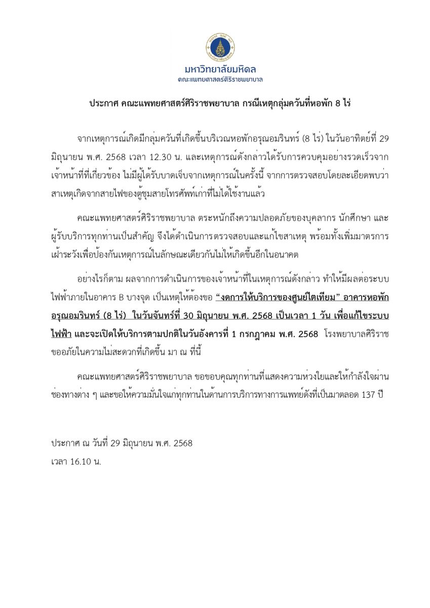 "ศิริราช" งดบริการศูนย์ไตเทียมวันที่ 30 มิ.ย. เป็นเวลา 1 วัน เนื่องจากสายไฟฟ้าภายในเจอผลกระทบ จากเหตุเพลิงไหม้หอพัก 8 ไร่