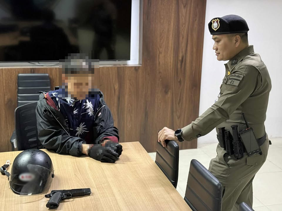 2 ตร.สายตรวจเมืองพัทยา ไหวพริบดีบุกชาร์จ หนุ่มสวมเสื้อ 5 ชั้น พกปืนปลอมนั่งดูเชิงหน้าร้านทองกลางห้าง จ.ชลบุรี