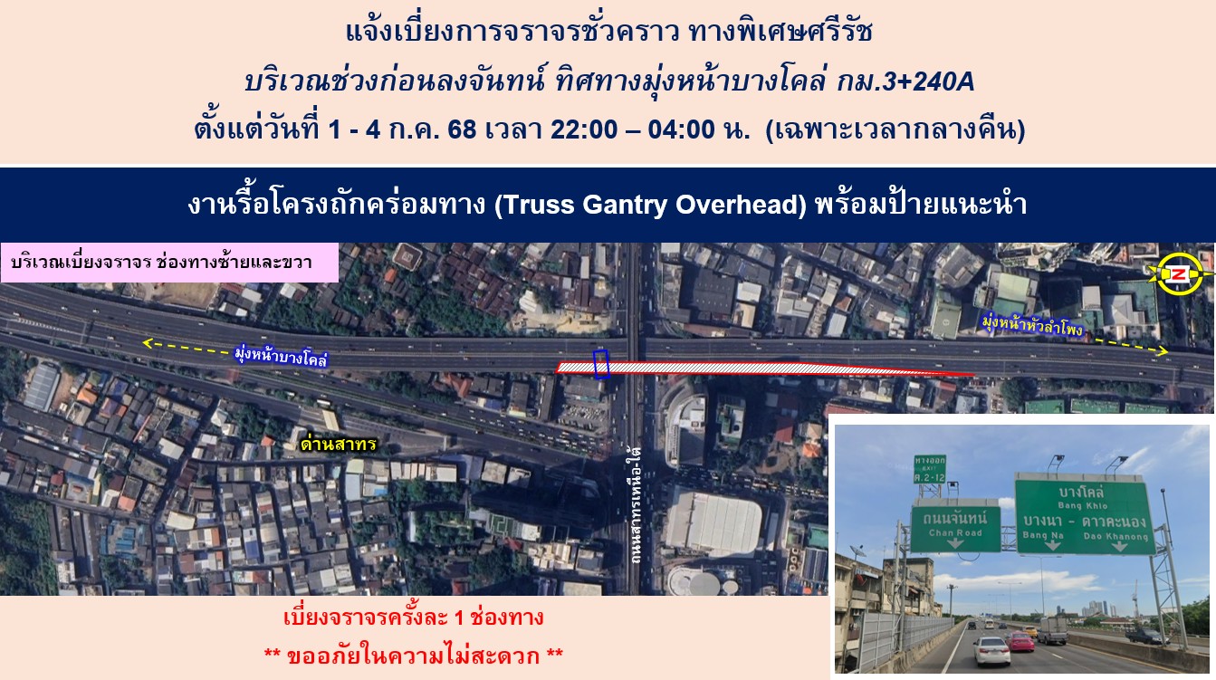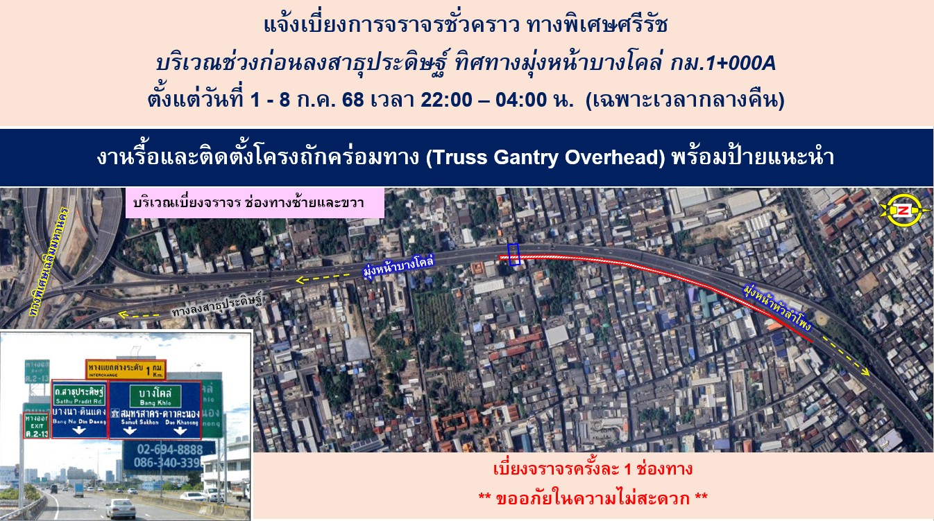 บริษัท ทางด่วนและรถไฟฟ้ากรุงเทพ จำกัด (มหาชน) หรือ BEM ประชาสัมพันธ์แจ้งเบี่ยง การจราจรทางพิเศษศรีรัช ช่วงก่อนลงสาธุประดิษฐ์ ทิศทางมุ่งหน้าบางโคล่ และช่วงก่อนลงจันทน์ ทิศทางมุ่งหน้าบางโคล่ เนื่องจากมีความจำเป็นต้องติดตั้งโครงถักคร่อมทาง พร้อมป้ายแนะนำ เพื่อความปลอดภัยของผู้ใช้ทาง โดยผู้ใช้ทางยังสามารถสัญจรได้ตามปกติ