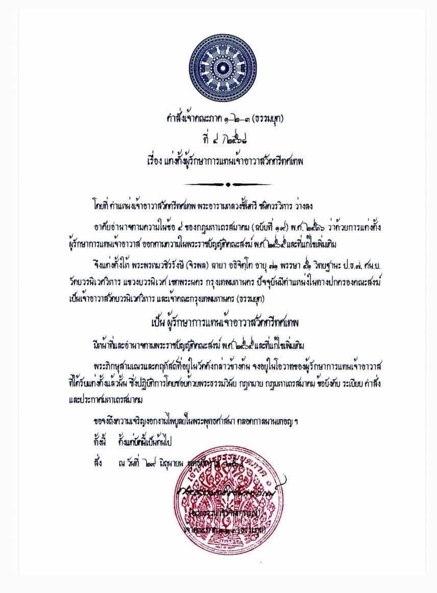 หลังการลาสิกขาของเจ้าอาวาส เจ้าคณะภาค 1-2-3 (ธรรมยุต) มีคำสั่งเจ้าคณะภาค 1-2-3 (ธรรมยุต) เรื่องแต่งตั้งผู้รักษาการแทนเจ้าอาวาสวัดตรีทศเทพ ระบุว่า โดยที่ตำแหน่งเจ้าอาวาสวัดตรีทศเทพ ว่างลง จึงแต่งตั้งให้พระพรหมวชิรรังษี เจ้าคณะกรุงเทพมหานคร (ธรรมยุต) เป็นผู้รักษาการแทนเจ้าอาวาสวัดตรีทศเทพ