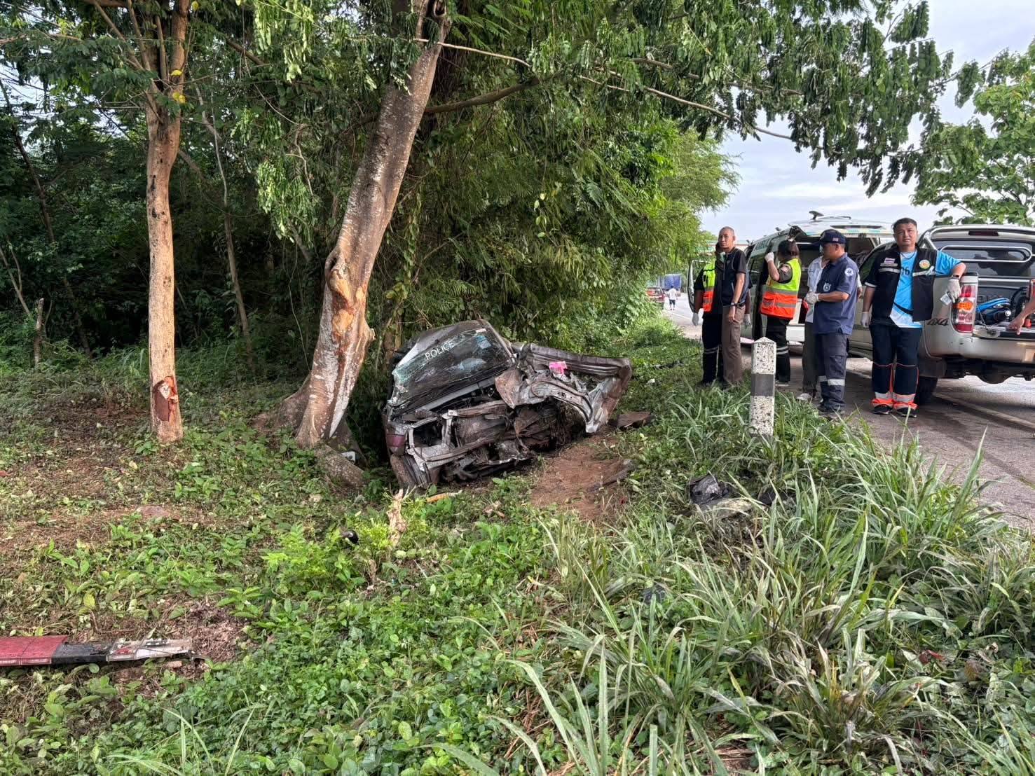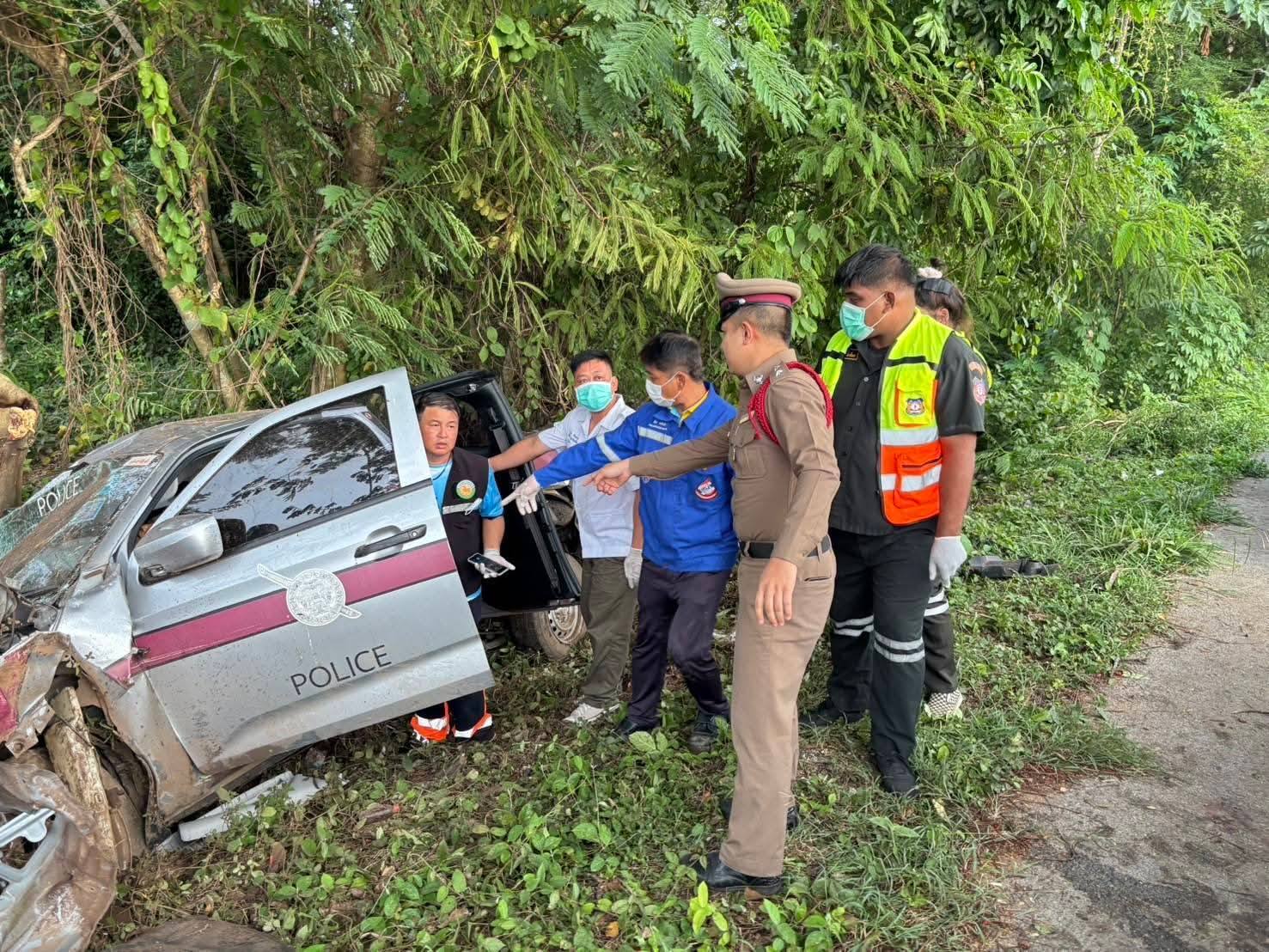 สิบตำรวจตรีขับรถกระบะตราโล่ห์ เสียหลักพลิกคว่ำชนต้นไม้ข้างทาง เสียชีวิตขณะเดินทางกลับหลังมาส่งสำนวนในตัวเมืองลำปาง