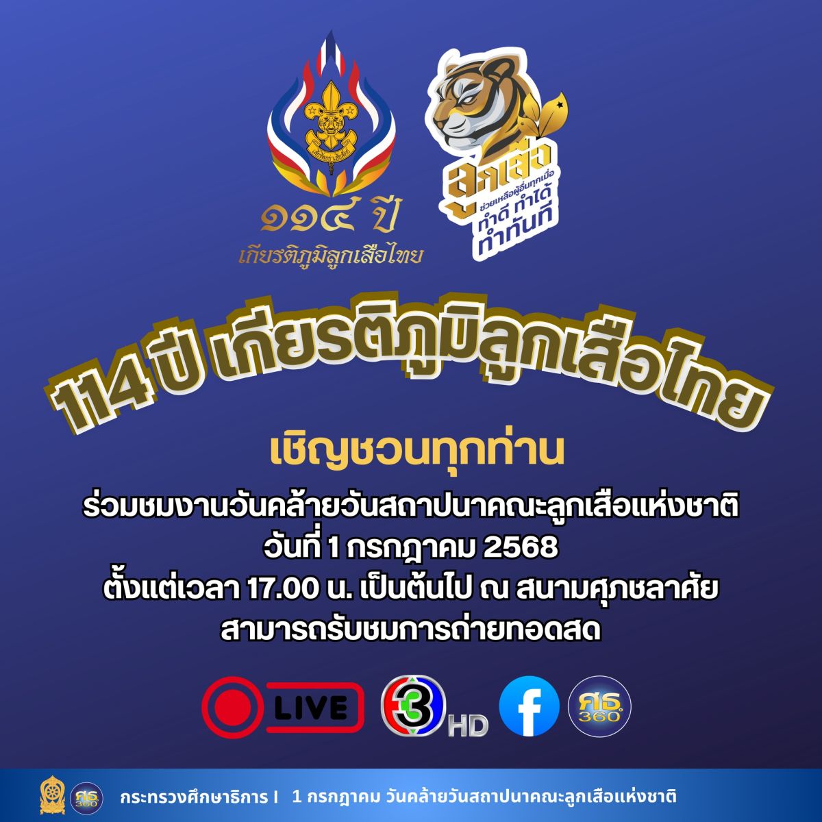 วันคล้ายวันสถาปนาคณะลูกเสือแห่งชาติ วันอังคารที่ 1 กรกฎาคม 2568 ตั้งแต่เวลา 17.00 น. เป็นต้นไป ณ สนามศุภชลาศัย