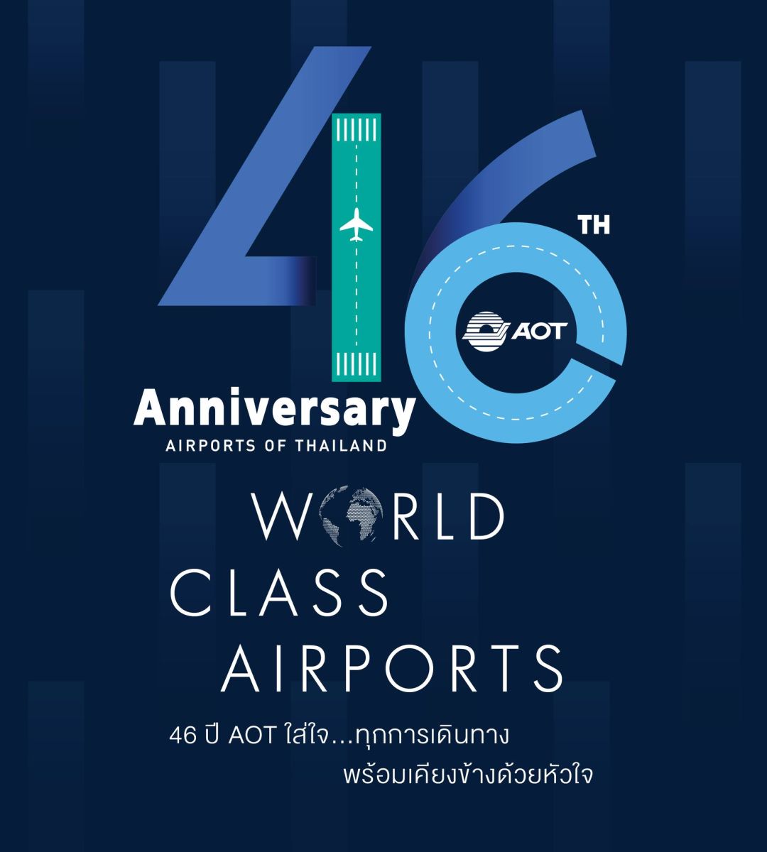 บริษัท ท่าอากาศยานไทย จำกัด (มหาชน) (AOT) ครบรอบ 46 ปี วันที่ 1 กรกฎาคม 2568 ประกาศจุดยืนความเป็นผู้นำด้านการบริหารท่าอากาศยานที่ดีระดับโลก มุ่งยกระดับการสร้างประสบการณ์ที่ดีที่สุดให้กับผู้โดยสาร พร้อมเร่งพัฒนาท่าอากาศยานทั้ง 6 แห่งอย่างต่อเนื่อง ขับเคลื่อนโครงสร้างพื้นฐานด้านคมนาคมทางอากาศของประเทศสู่มาตรฐานระดับสากล