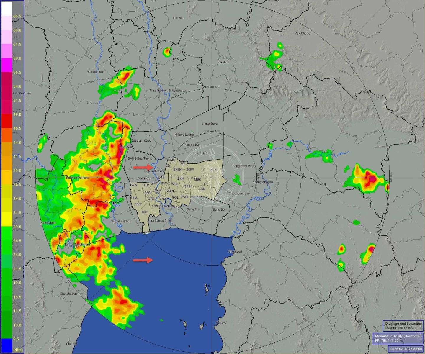 1 ก.ค.68 ตั้งแต่เวลา 15.30 น. กลุ่มฝน กลุ่มใหญ่ เคลื่อนตัวทิศตะวันตก เคลื่อนเข้าสู่พื้นที่ กทม-ปริมณฑล หลังจากนั้น เวลา 16.00 น. กลุ่มฝน เข้าปกคลุมหลายพื้นที่ กทม-ปริมณฑล รวมถึงกระแสลมแรง