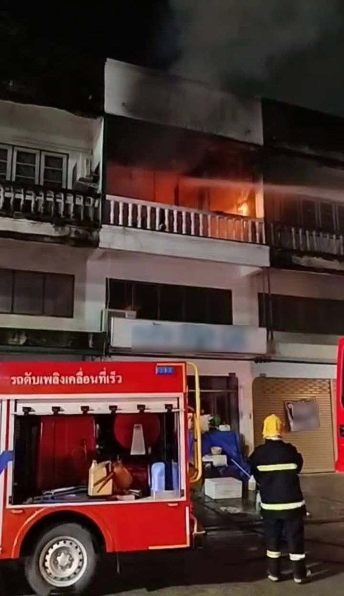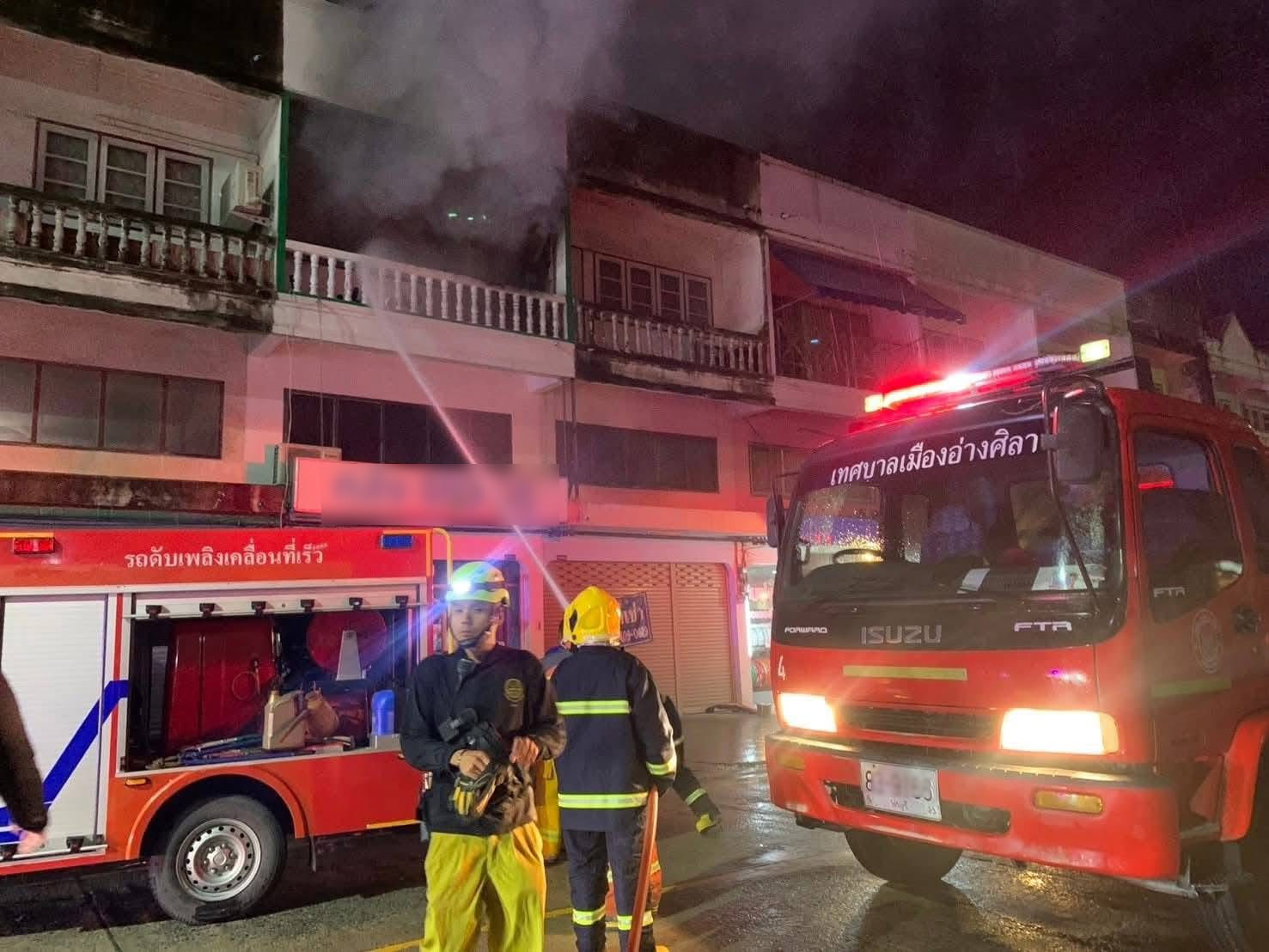 ไฟไหม้บนชั้น 2 อาคารพาณิชย์ริมถนน จนท.พร้อมรถดับเพลิงระดมฉีดน้ำควบคุมเพลิงได้ก่อนจะลุกลาม จ.ชลบุรี