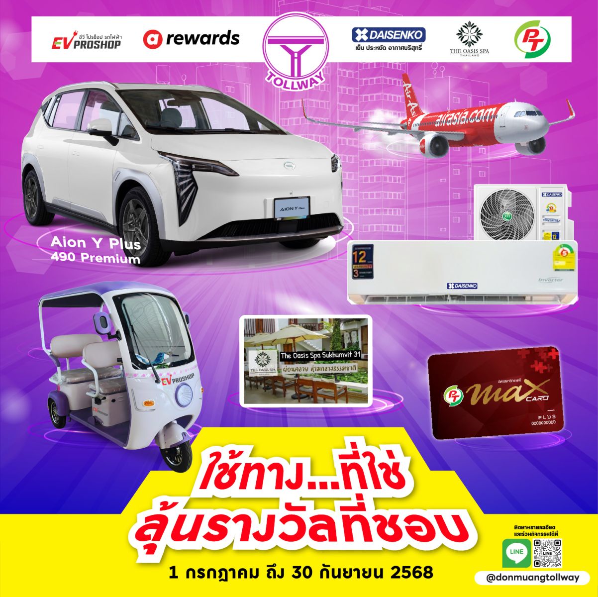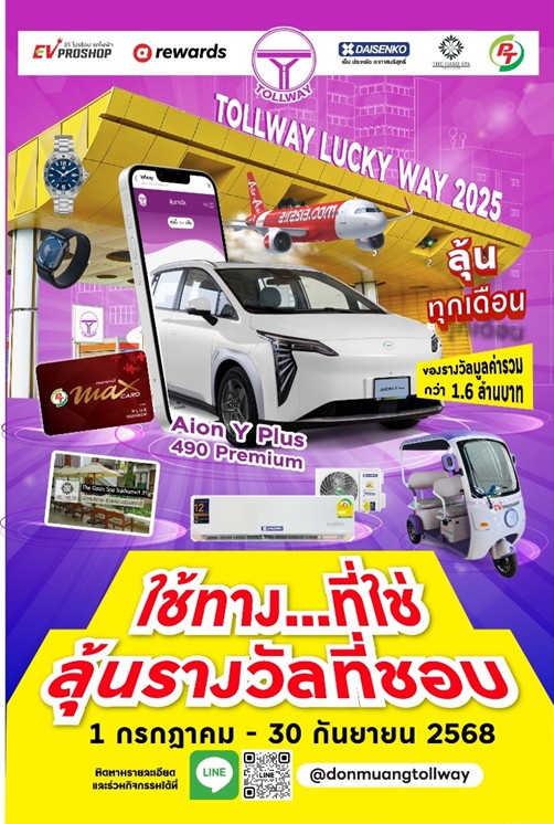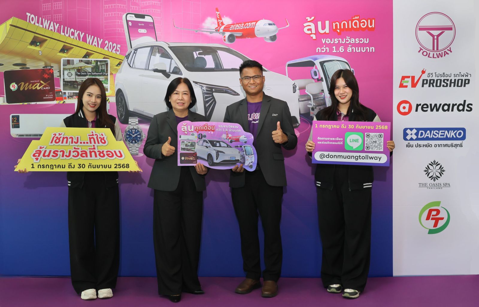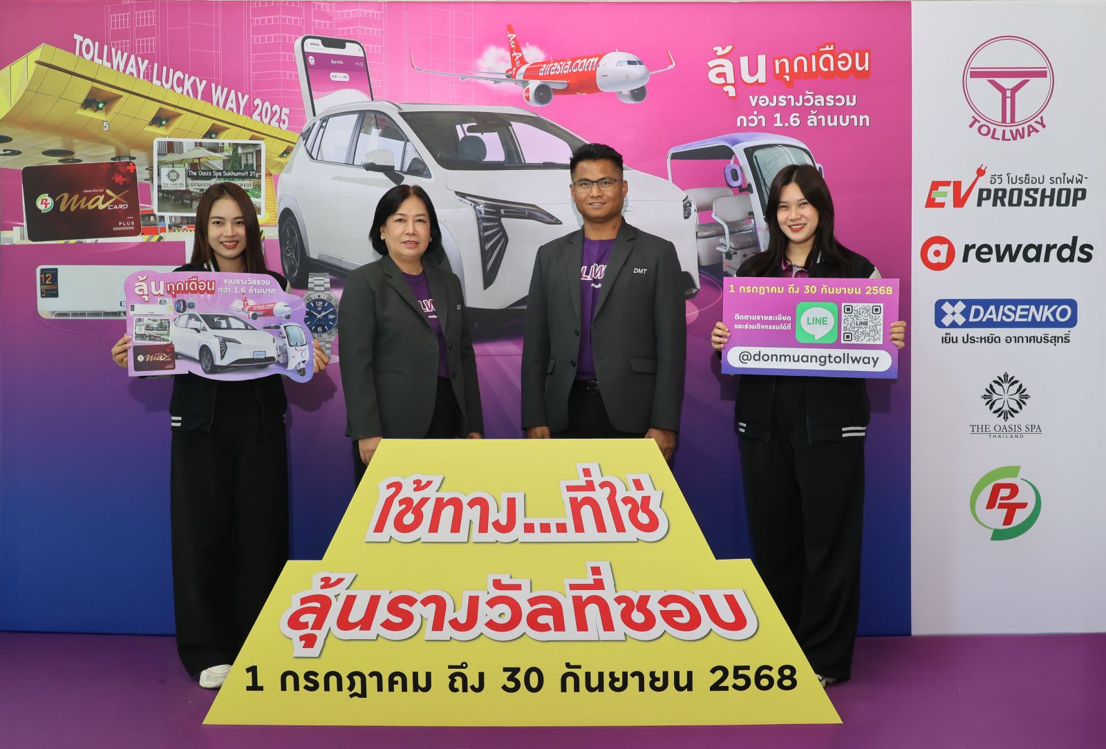 นางสาวอัจฉรา เจริญพร (คนที่2จากซ้าย) ผู้ช่วยกรรมการผู้จัดการอาวุโส สายงานพัฒนาความยั่งยืนองค์กร และนายนพพล โพธิ์ขี (คนที่3จากซ้าย) ผู้อำนวยการฝ่ายพัฒนาธุรกิจและกลยุทธ์เพื่อความยั่งยืนบริษัท ทางยกระดับดอนเมือง จำกัด (มหาชน) หรือ DMT เปิดแคมเปญขอบคุณผู้ใช้ทาง “Tollway Lucky Way 2025” ภายใต้คอนเซ็ปต์ “ใช้ทางที่ใช่...ลุ้นรางวัลที่ชอบ” เริ่ม 1 ก.ค. - 30 ก.ย. นี้ โดยจะจับรางวัลให้ได้ลุ้นกันทุกเดือน รวมทั้งสิ้น 167 รางวัล มูลค่ากว่า 1.6 ล้านบาท ไม่ว่าจะเป็นรถยนต์ไฟฟ้า แต้ม Air Asia Point กิจกรรมท่องเที่ยวพักผ่อนเพื่อเติมพลังใจ หรือแก็ดเจ็ตล้ำ ๆ ที่ช่วยอำนวยความสะดวกให้กับชีวิตของคุณ เหมือนกับการใช้บริการทางยกระดับดอนเมือง ที่ไม่ได้มีดีแค่ความสะดวก รวดเร็ว ปลอดภัย แต่ยังช่วยให้คุณประหยัดเวลา และสามารถนำเวลาอันมีค่านั้นไปใช้ทำสิ่งดี ๆ ให้กับตัวเองและคนที่คุณรักได้มากยิ่งขึ้น โดยสามารถเริ่มสะสมแต้มมาแลกเป็นสิทธิ์ลุ้นรางวัล ได้ทาง LINE Official Account : @donmuangtollway และติดตามรายละเอียดกิจกรรม Facebook : Don Muang Tollway