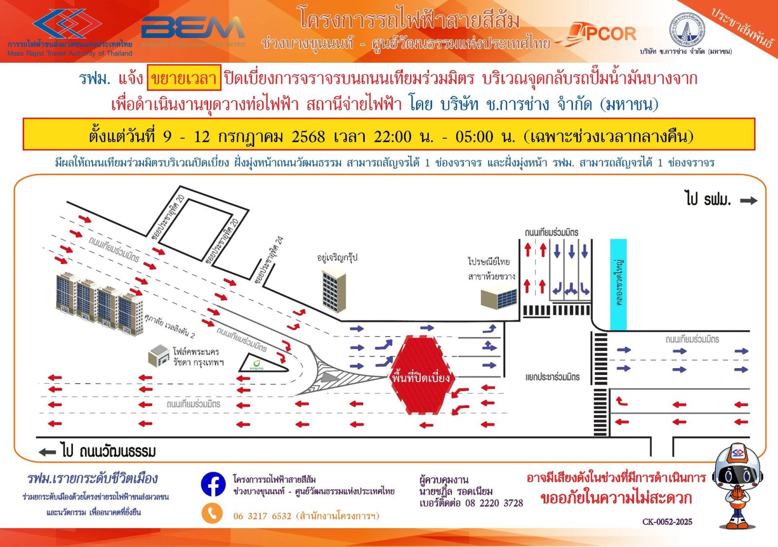 การรถไฟฟ้าขนส่งมวลชนแห่งประเทศไทย (รฟม.) แจ้งว่า บริษัท ช.การช่าง จำกัด (มหาชน) ผู้รับจ้างออกแบบและก่อสร้างอุโมงค์ทางวิ่งและสถานีใต้ดิน โครงการรถไฟฟ้าสายสีส้ม ช่วงบางขุนนนท์ – ศูนย์วัฒนธรรมแห่งประเทศไทย มีความจำเป็นต้องปิดเบี่ยงการจราจร บนถนนเทียมร่วมมิตร บริเวณจุดกลับรถปั๊มน้ำมันบางจาก เพื่อดำเนินงานขุดวางท่อไฟฟ้า สถานีจ่ายไฟฟ้า ตั้งแต่วันที่ 9 – 15 กรกฎาคม 2568 เวลา 22.00 - 05.00 น. (เฉพาะช่วงเวลากลางคืน) โดยมีรายละเอียดดังนี้