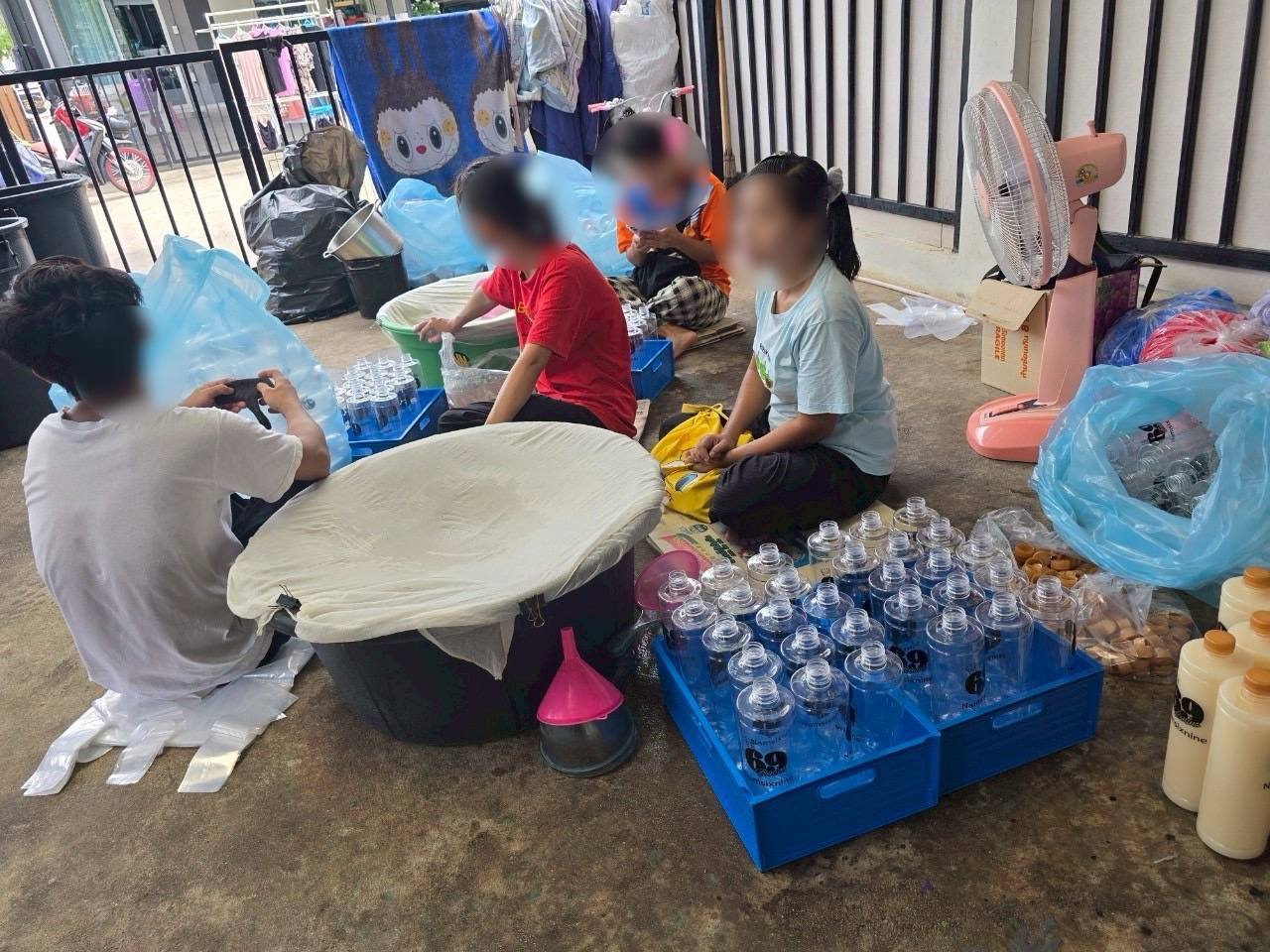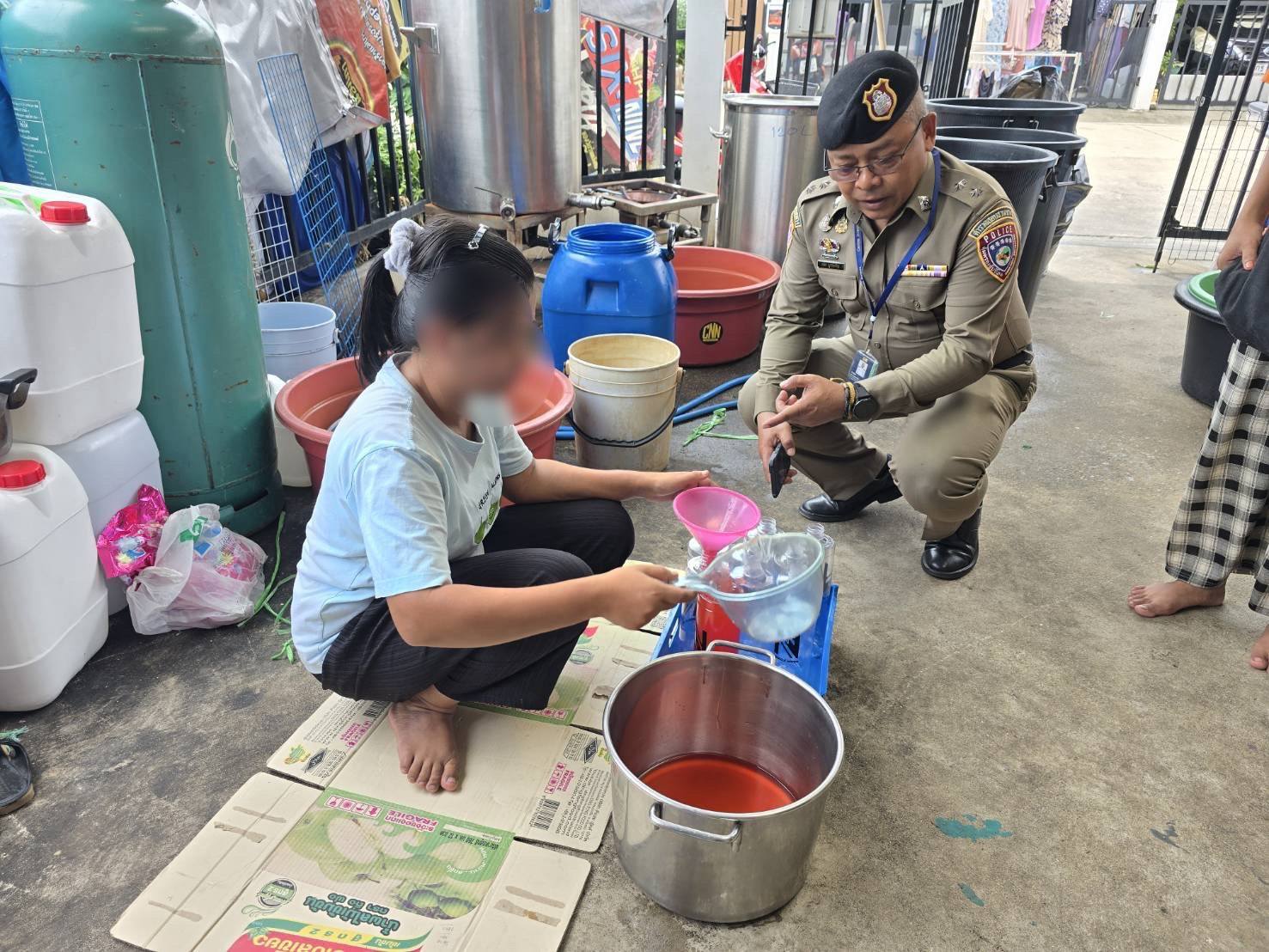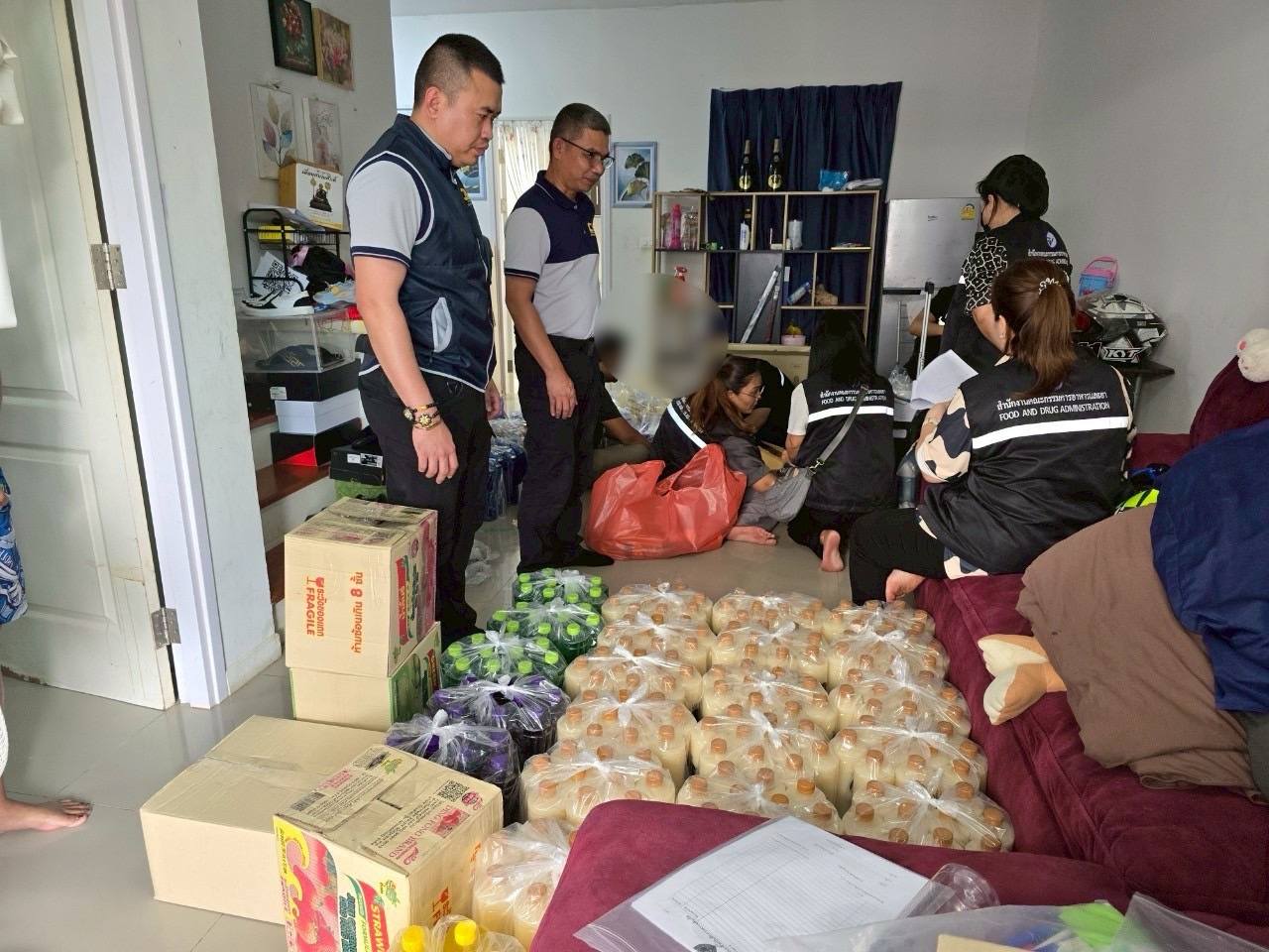ต่อมาเมื่อวันที่ 1 กรกฎาคม 2568 เจ้าหน้าที่ตำรวจ กก.4 บก.ปคบ. ได้ร่วมกับเจ้าหน้าที่สำนักงานคณะกรรมการอาหารและยา(อย.) นำหมายค้นของศาลจังหวัดพระประแดง เข้าตรวจค้นสถานที่ผลิต ภายในบ้านพักอาศัย ในพื้นที่ อ.พระสมุทรเจดีย์ จ.สมุทรปราการ พบ นางสาว ธา (นามสมมุติ) อายุ 41 ปี เป็นผู้นำตรวจค้น โดยขณะตรวจค้นพบว่า มีการใช้โรงจอดรถบริเวณหน้าบ้านในการผลิต โดยต้มใบกระท่อมต้มในหม้อ จากนั้นนำมาผสมน้ำเชื่อมรสชาติต่างๆ และใช้แรงงานประเทศเพื่อนบ้านนั่งกรอกลงขวดบรรจุภัณฑ์โดยไม่สวมถุงมือแต่อย่างใด โดยสถานที่ใช้ผลิตไม่ได้รับอนุญาต และไม่ถูกสุขลักษณะอนามัย ตรวจยึดผลิตภัณฑ์เครื่องดื่มสำเร็จรูป วัตถุดิบ อุปกรณ์ในการผลิต ดังนี้