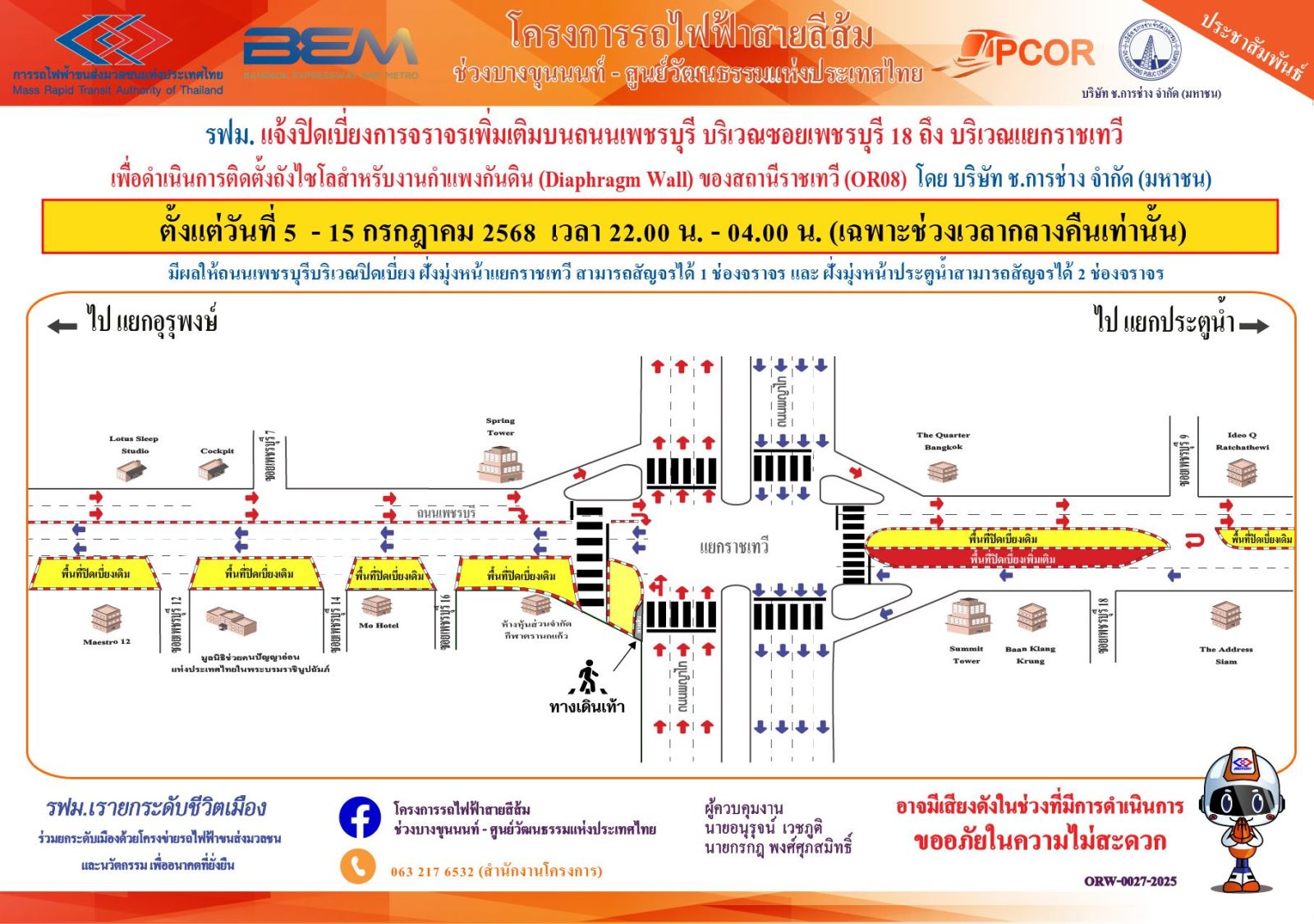 การรถไฟฟ้าขนส่งมวลชนแห่งประเทศไทย (รฟม.) แจ้งว่า บริษัท ช.การช่าง จำกัด (มหาชน) ผู้รับจ้างออกแบบและก่อสร้างอุโมงค์ทางวิ่งและสถานีใต้ดิน โครงการรถไฟฟ้าสายสีส้ม ช่วงบางขุนนนท์ – ศูนย์วัฒนธรรมแห่งประเทศไทย มีความจำเป็นต้องปิดเบี่ยงการจราจรเพิ่มเติม 1 ช่องจราจร บนถนนเพชรบุรี ฝั่งมุ่งหน้าแยกราชเทวี บริเวณซอยเพชรบุรี 18 ถึงบริเวณแยกราชเทวี เพื่อดำเนินการติดตั้งถังไซโลสำหรับงานกำแพงกันดิน(Diaphragm Wall) สถานีราชเทวี (OR08) ตั้งแต่วันที่ 5 – 15 กรกฎาคม 2568 เวลา 22.00 น. – 04.00 น. (เฉพาะช่วงเวลากลางคืนเท่านั้น) มีผลให้ถนนเพชรบุรีบริเวณปิดเบี่ยง ฝั่งมุ่งหน้าแยกราชเทวี สามารถสัญจรได้ 1 ช่องจราจร และฝั่งมุ่งหน้าแยกประตูน้ำ สามารถสัญจรได้ 2 ช่องจราจร โดยประชาชนสามารถเข้า – ออกที่พักอาศัยได้ตามปกติ