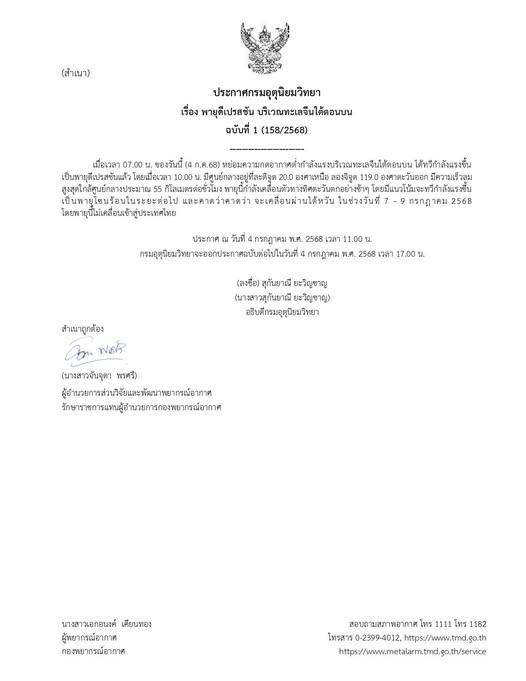 4 กรกฎาคม 2568 กรมอุตุนิยมวิทยา ประกาศ เรื่อง พายุดีเปรสชัน บริเวณทะเลจีนใต้ตอนบน ฉบับที่ 1 (158/2568) ระบุว่า เมื่อเวลา 07.00 น.ของวันนี้ (4 ก.ค.68) หย่อมความกดอากาศต่ำกำลังแรงบริเวณทะเลจีนใต้ตอนบน ได้ทวีกำลังแรงขึ้นเป็นพายุดีเปรสชันแล้ว