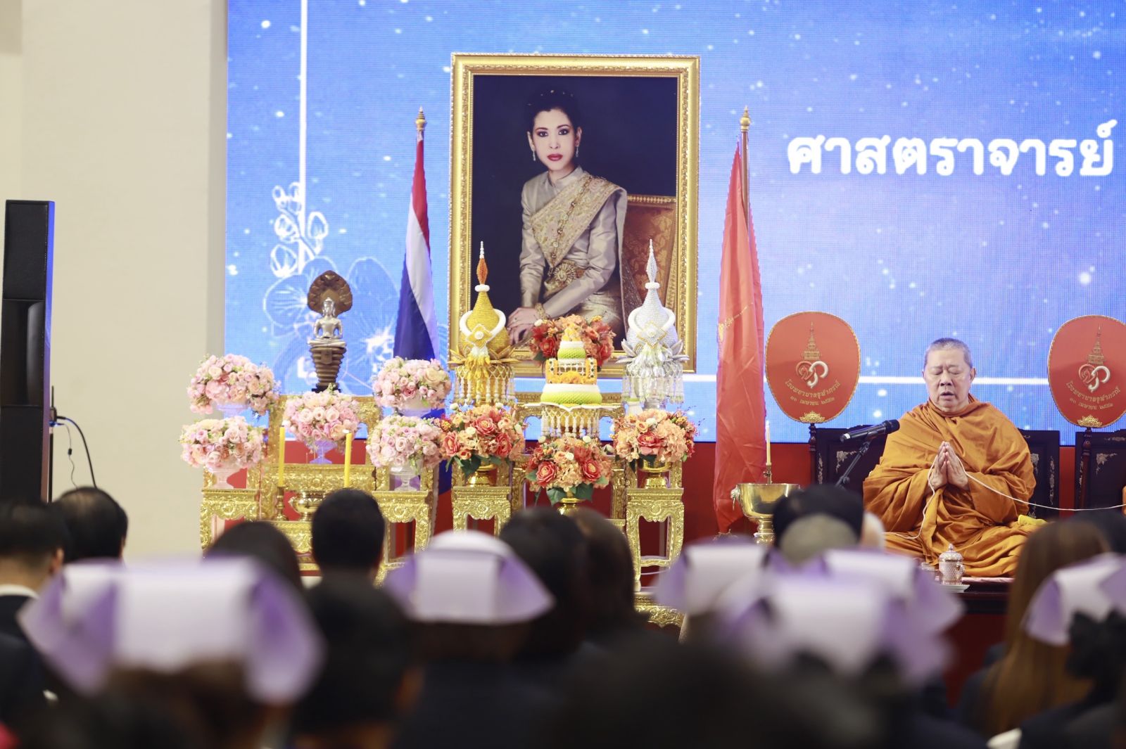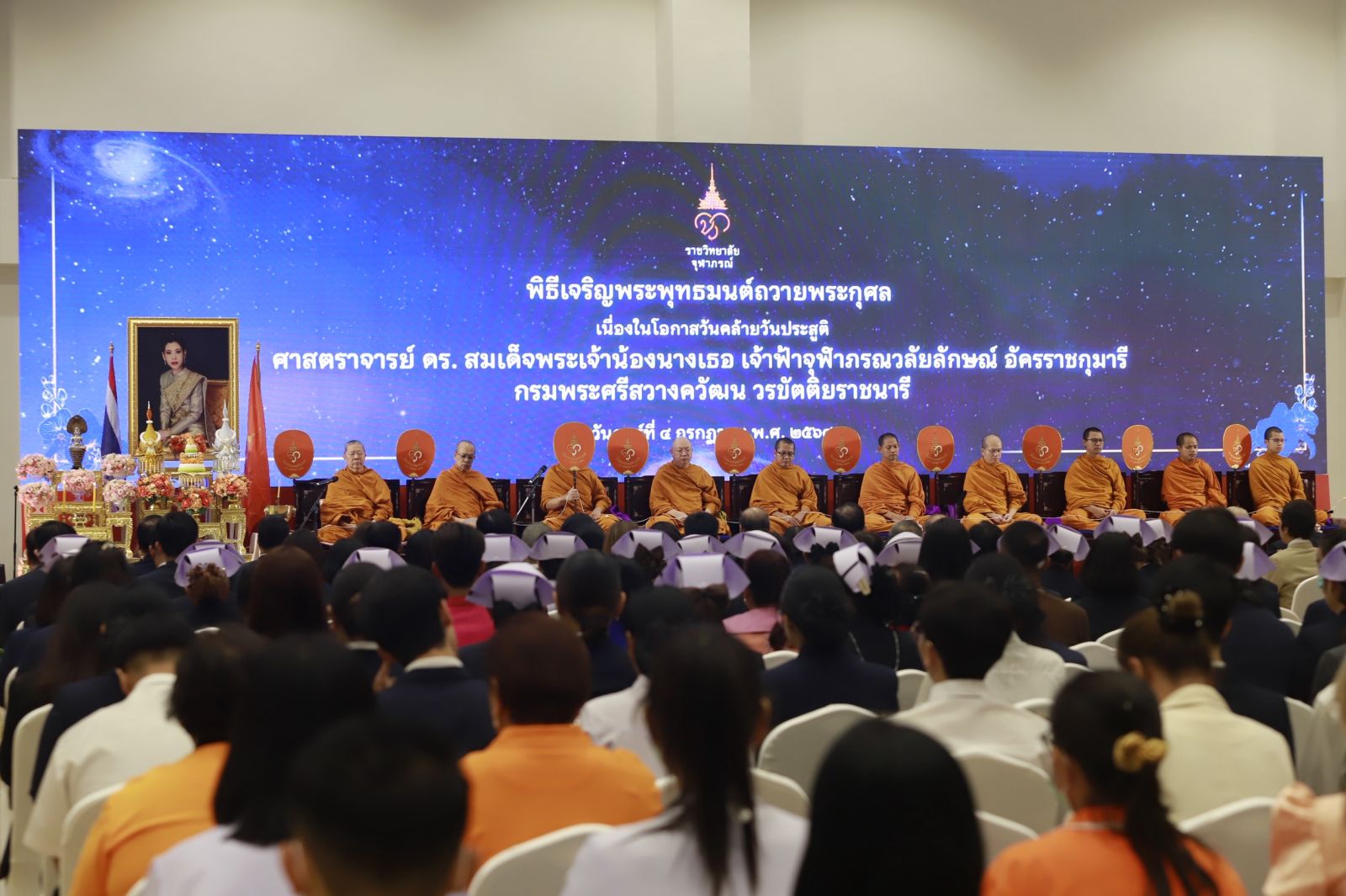 กรุงเทพฯ วันที่ ๔ กรกฎาคม ๒๕๖๘ : ราชวิทยาลัยจุฬาภรณ์ จัดพิธีถวายพระพรชัยมงคลและกิจกรรมเทิดพระเกียรติถวายเป็นพระกุศล เนื่องในโอกาสวันคล้ายวันประสูติ ศาสตราจารย์ ดร. สมเด็จพระเจ้าน้องนางเธอ เจ้าฟ้าจุฬาภรณวลัยลักษณ์ อัครราชกุมารี กรมพระศรีสวางควัฒน วรขัตติยราชนารี องค์ประธานและนายกสภาราชวิทยาลัยจุฬาภรณ์ ทรงเจริญพระชันษา ๖๘ ปี โดยมี สมเด็จพระมหารัชมงคลมุนี (ธงชัย ธมฺมธโช) เป็นประธานฝ่ายสงฆ์ และดร.ฐากูร พานิช รักษาการรองเลขาธิการราชวิทยาลัยจุฬาภรณ์ เป็นประธานในพิธี พร้อมด้วยคณะผู้บริหาร บุคลากรราชวิทยาลัยจุฬาภรณ์ ข้าราชการ บุคลากรจากหน่วยงานสถาบันภาคีเครือข่ายและประชาชนเข้าร่วมพิธี ณ ชั้น ๖ อาคารกรมพระศรีสวางควัฒน โรงพยาบาลจุฬาภรณ์ ราชวิทยาลัยจุฬาภรณ์ เพื่อร่วมถวายความจงรักภักดีน้อมสำนึกในพระกรุณาธิคุณที่ทรงปฏิบัติพระกรณียกิจนานัปการเพื่อบำบัดทุกข์บำรุงสุขแก่อาณาประชาราษฎร์บนผืนแผ่นดินไทย ด้วยพระปณิธานอันแน่วแน่ในการพัฒนางานทางด้านวิทยาศาสตร์การแพทย์และการสาธารณสุขของประเทศไทย เพื่อช่วยเหลือบรรเทาความทุกข์ยากจากความเจ็บป่วยของประชาชน โดยเฉพาะผู้ป่วยโรคมะเร็ง ตลอดจนทรงส่งเสริมการเพิ่มขีดความสามารถด้านการศึกษาวิจัยและการพัฒนาเภสัชภัณฑ์สำหรับผู้ป่วยโรคมะเร็งให้ต่อเนื่องสมบูรณ์ตั้งแต่ต้นน้ำถึงปลายน้ำด้วยเทคโนโลยีที่ทันสมัยผ่านพระกรณียกิจนานัปการอันเกิดเป็นคุณูปการสำคัญต่อวงการสาธารณสุขไทย อีกทั้งพระปรีชาสามารถที่เป็นเลิศด้านทัศนศิลป์และการสร้างสรรค์งานศิลปะร่วมสมัยหลากหลายสาขา อันสะท้อนให้เห็นถึงพระอัจฉริยภาพเสมือนจักรวาลแห่งน้ำพระทัยที่ทรงตั้งมั่นให้งานศิลปะสร้างความสุขทางใจและยังประโยชน์ต่อยอดสู่การช่วยเหลือประชาชน รวมทั้งยังทรงเป็นแรงบันดาลใจในการส่งเสริมสนับสนุนให้เด็กเยาวชนและผู้ที่รักในงานศิลปะสามารถใช้จินตนาการ ความรู้ความสามารถสร้างสรรค์ผลงานศิลปะ เพื่อกล่อมเกลาจิตใจและใช้เวลาว่างให้เกิดประโยชน์สูงสุด นับเป็นพระกรุณาธิคุณและพระเมตตาอันสูงสุดแก่พสกนิกรไทย