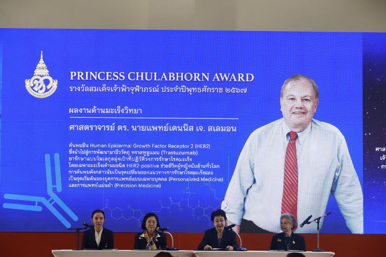 ด้าน มูลนิธิรางวัลสมเด็จเจ้าฟ้าจุฬาภรณ์ ในพระอุปถัมภ์ สมเด็จพระเจ้าน้องนางเธอ เจ้าฟ้าจุฬาภรณวลัยลักษณ์ อัครราชกุมารี กรมพระศรีสวางควัฒน วรขัตติยราชนารี นำโดย รองศาสตราจารย์ ดร.ทัศนา บุญทอง เลขาธิการและกรรมการมูลนิธิ ฯ พร้อมด้วย ศาสตราจารย์เกียรติคุณ แพทย์หญิงสฤกพรรณ วิไลลักษณ์ ประธานคณะกรรมการสรรหาและกลั่นกรอง ฯ ศาสตราจารย์ แพทย์หญิงจิรพร เหล่าธรรมทัศน์ ที่ปรึกษาฝ่ายประชาสัมพันธ์ฯ และรองศาสตราจารย์ แพทย์หญิงชนิสา โชติพานิช ประธานกรรมการดำเนินงานจัดประชุมวิชาการรางวัลสมเด็จเจ้าฟ้าจุฬาภรณ์ ได้ร่วมกันแถลงถึงผลการตัดสินผู้ได้รับพระราชทาน“รางวัลสมเด็จเจ้าฟ้าจุฬาภรณ์” “Princess Chulabhorn Award” ประจำปี ๒๕๖๗ ซึ่งเป็นรางวัลระดับนานาชาติที่จัดตั้งขึ้นเพื่อเทิดพระเกียรติและเผยแพร่พระเกียรติคุณ ด้วยสำนึกในพระกรุณาธิคุณที่ทรงมีต่อประชาชนชาวไทยโดยเฉพาะด้านการวิจัยและพัฒนาเพื่อการป้องกัน ควบคุมโรคมะเร็ง และการดูแลรักษาผู้ป่วยมะเร็ง นอกจากทรงเป็นนักวิทยาศาสตร์แล้ว ได้ทรงตระหนักถึงความสำคัญในการพัฒนาคุณภาพการดูแลรักษาผู้ป่วยมะเร็ง ทรงก่อตั้งโรงพยาบาลจุฬาภรณ์เพื่อเป็นโรงพยาบาลสำหรับผู้ป่วยมะเร็งขึ้นเป็นการเฉพาะ เปิดบริการแก่ประชาชนทั่วไปตั้งแต่วันที่ ๒๙ ตุลาคม พ.ศ. ๒๕๕๒ มีการพัฒนาอย่างต่อเนื่อง มีความเจริญก้าวหน้าและมีชื่อเสียงเป็นที่ไว้วางใจของประชาชน ทรงอุทิศพระวรกายในการปฏิบัติพระกรณียกิจนานัปการเพื่อการพัฒนาค้นคว้าวิจัย พัฒนาบุคลากรทางการแพทย์ ตลอดจนการนำเทคโนโลยีใหม่ ๆ เข้ามาประยุกต์ใช้และยกระดับการรักษาโรคมะเร็งในประเทศไทยให้ได้มาตรฐานสากลทัดเทียมนานาประเทศ ทั้งนี้ มูลนิธิรางวัลสมเด็จเจ้าฟ้าจุฬาภรณ์ ในพระอุปถัมภ์ ฯ จะดำเนินการคัดเลือกและประกาศผลผู้ได้รับรางวัล ฯ เป็นประจำทุกปี จำนวน ๑ รางวัล ผู้ได้รับรางวัลจะได้รับโล่รางวัล และเงินรางวัล ๕๐,๐๐๐ เหรียญสหรัฐ โดยมีกำหนดการเข้ารับพระราชทานรางวัลอันทรงเกียรตินี้ในเดือนกรกฎาคมของทุกปี สำหรับ ผู้ที่ได้รับการพิจารณาคัดเลือกเป็นผู้ที่ได้รับพระราชทานรางวัลเจ้าฟ้าจุฬาภรณ์ ประจำปีพุทธศักราช ๒๕๖๗ ซึ่งนับเป็นท่านที่สองตั้งแต่มีการจัดตั้งมูลนิธิรางวัลสมเด็จเจ้าฟ้าจุฬาภรณ์ ฯ ขึ้นมา ได้แก่ ศาสตราจารย์ ดร. นายแพทย์เดนนิส เจ. สเลมอน (Dennis J. Slamon, MD) อายุรแพทย์โรคมะเร็งชาวอเมริกัน ปัจจุบันปฏิบัติงานอยู่ ณ มหาวิทยาลัยแห่งรัฐแคลิฟอเนียร์ เมืองลอสแองเจลิส ประเทศสหรัฐอเมริกา (The University of California, Los Angeles, USA) ซึ่งท่านเป็นผู้ค้นพบยีน Human Epidermal Growth Factor Receptor 2 (HER2) ซึ่ง